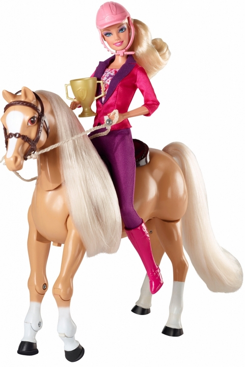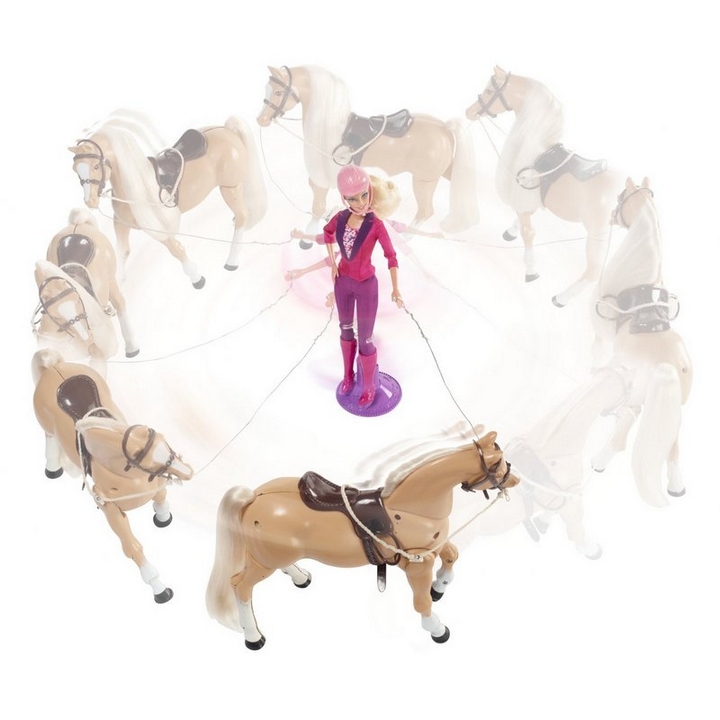 Teraz każda dziewczynka będzie mogła zamienić się w małą dżokejkę i trenować konika Tawny razem z Barbie. Wystarczy włączyć konika za pomocą specjalnego przycisku i ustawić Barbie na dołączonej do zestawu podstawce, aby ćwiczyła konika na lonży. Po przekręceniu głowy konika w prawo, będzie on chodził wokół Barbie w kierunku ruchu wskazówek zegara. Po przekręceniu w lewo konik pójdzie w przeciwnym kierunku. Po treningu Barbie może dosiąść konika i jechać na wprost, w prawo, bądź w lewo. Lalka nie spadnie z konika, ponieważ ma specjalnie dostosowane, profesjonalne siodło.