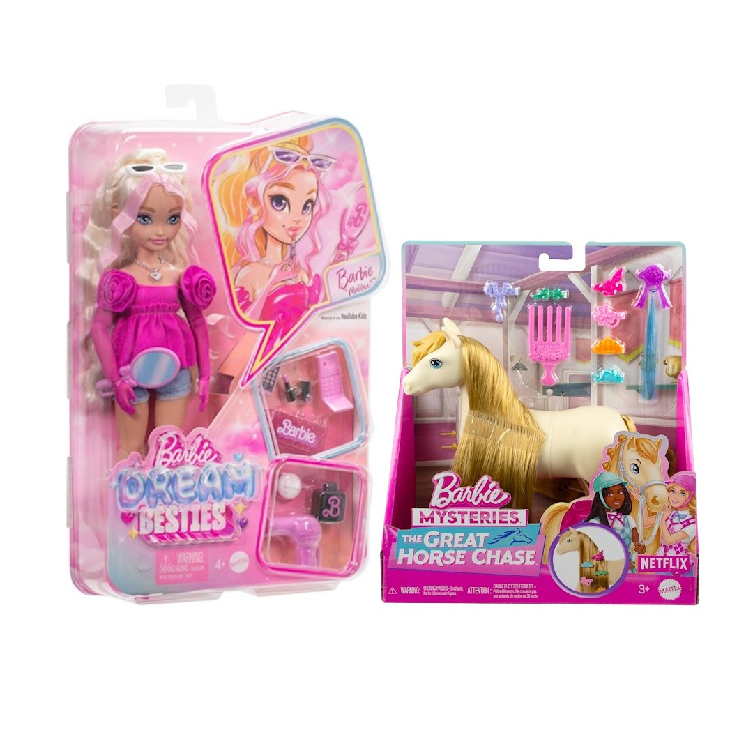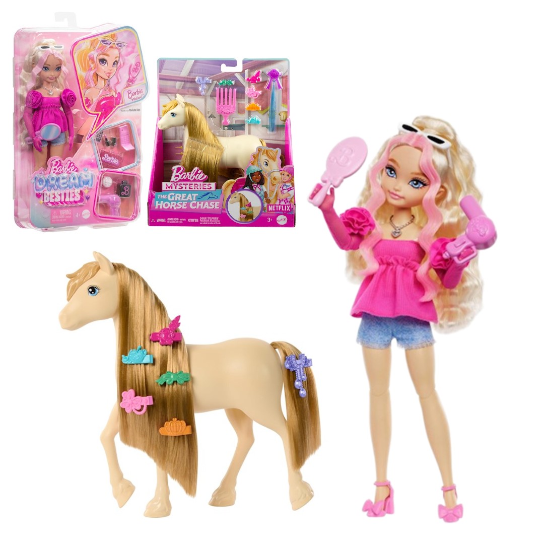 Barbie Dream Besties pokazują, że kiedy dzielisz się swoimi wyjątkowymi talentami ze światem, wszystko jest możliwe! Zobacz Barbie 'Malibu', Teresę i Renee, Barbie 'Brooklyn' jakich jeszcze nie widziałaś! Każda modna lalka jest wyposażona w akcesoria, które łączą się z ich indywidualnymi osobowościami i zainteresowaniami! W zestawie znajduje się również kucyk, którego można dowolnie wystylizować. Poznaj najlepszego przyjaciela lalek Barbie „Malibu” i „Brooklyn”: koń Tornado. Koń ma bardzo długą grzywę i ogon, a do tego przyczepiane pasemko włosów, grzebyczek i 6 spinek do stylizacji.