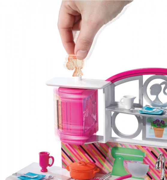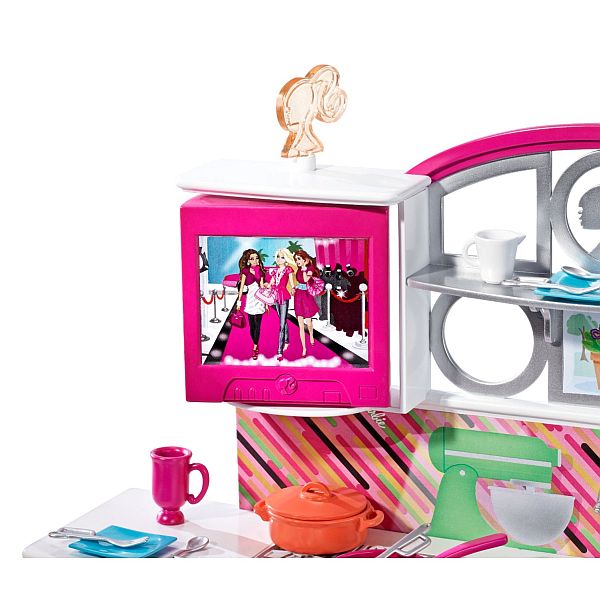 Zestaw kuchenny to super nowoczesny i wytworny komplet szafek kuchennych! W piekarniku piecze się ciasto, na kuchence gotują się inne pyszności. Wśród kuchennych akcesoriów znajdziesz garnki, kubeczki, pojemniczki i inne rzeczy. Aby wygodniej się pracowało Lalka Barbie będzie mogła skorzystać z piekarnika, kuchenki, zlewozmywaka, obracanej szafki w której ukryty jest telewizor oraz wysokiego krzesełka.