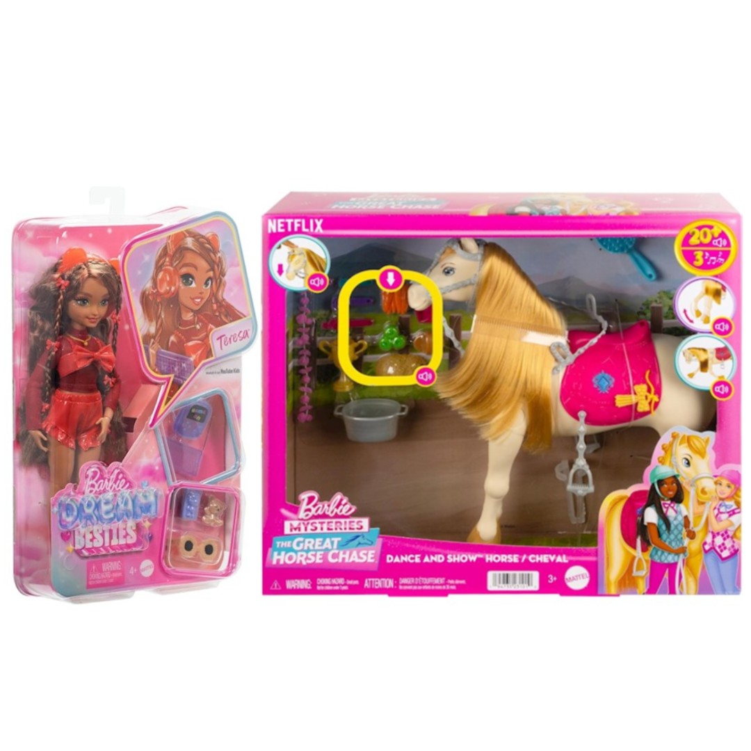 Barbie Dream Besties pokazują, że kiedy dzielisz się swoimi wyjątkowymi talentami ze światem, wszystko jest możliwe! Zobacz Barbie 'Malibu', Teresę i Renee, Barbie 'Brooklyn' jakich jeszcze nie widziałaś! Każda modna lalka jest wyposażona w akcesoria, które łączą się z ich indywidualnymi osobowościami i zainteresowaniami! W zestawie znajduje się również interaktywny koń Tornado - zabawka z ponad 20 dźwiękowymi aktywacjami i mnóstwem zabawy, od opieki i pielęgnacji po taniec i stylizację fryzur. Zabawka dla dzieci koń Barbie imituje taneczny ruch, mruganie oczami, odtwarza muzykę inspirowaną serialem i wydaje wesołe końskie dźwięki. Dzięki akcesoriom możesz puścić wodze wyobraźni w kreatywnej zabawie z konikiem dla lalki Barbie Tornado!