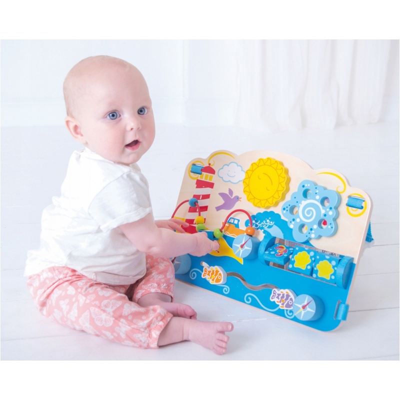 Kolorowe drewniane centrum aktywności dostarczy maluszkowi wiele atrakcji. Zabawka posiada paski umożliwiające przyczepienie jej np. do ramy łóżeczka czy wózka. Większość elementów zabawki jest ruchomych. Metalowy labirynt pozwala prowadzić koraliki w różnych kierunkach. Słoneczko i niebieska fala z otworami się obracają - gałeczki z tyłu planszy pozwalają kręcić nimi z drugiej strony. Podobnie jak obracana układanka z konikiem morskim i muszelkami oraz rybki pływające po falach.