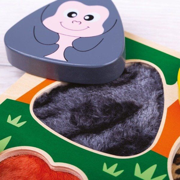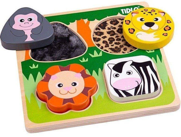 Idealna układanka dla najmłodszych. Duże elementy zaciekawią dziecko i zachęcą do zabawy. Dziecko pozna różne tekstury ukryte pod każdym ze zwierząt. Drewniana układanka przedstawia 4 zwierzątka z safari: lamparta, goryla, lwa i zebrę wykonane z drewna i materiałów tekstylnych. Zabawka zachęca do wczesnego rozpoznawania kształtu.