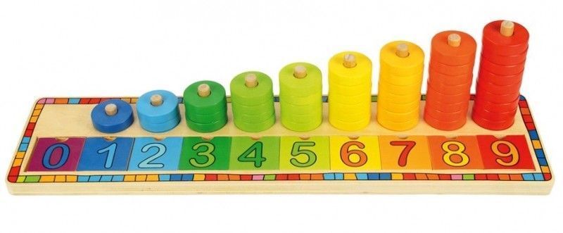 Bigjigs Duże drewniane liczydło nauka liczydła 531 zabawka, która łączy w sobie naukę liczenia i dobrą zabawę. Na drewnianej podstawie umieszczonych jest 9 słupków, na które należy nakładać taką ilość krążków jaka jest napisana poniżej. Każda cyfra napisana na kwadraciku ma inny kolor odpowiadający kolorowi krążków. Dodatkowo kwadracik z cyferką można zdejmować z podstawy, aby pod nim zobaczyć odpowiadającą mu liczbę kropek.