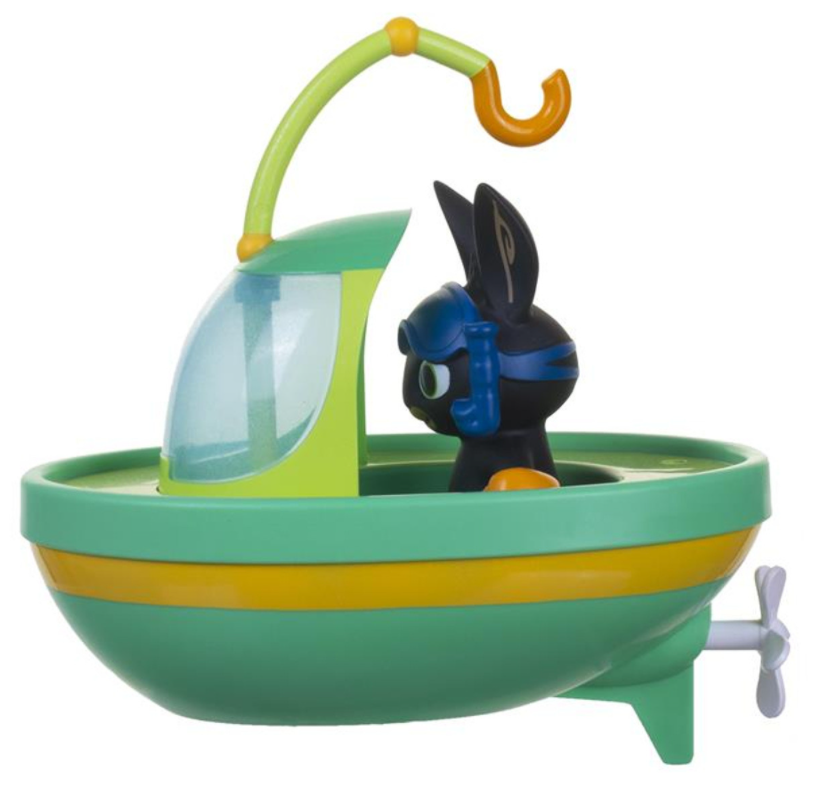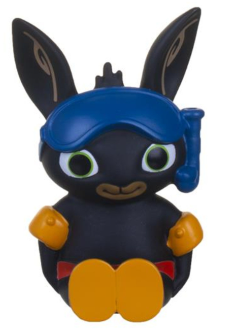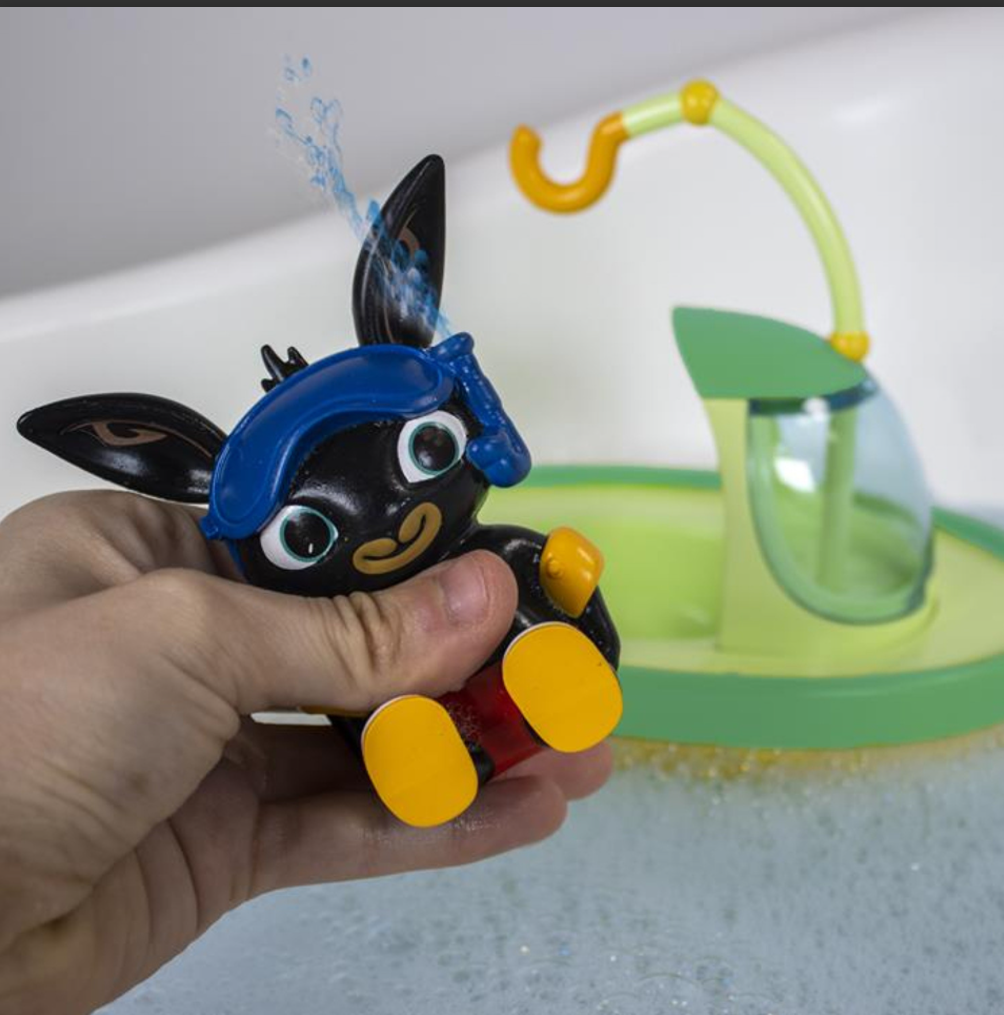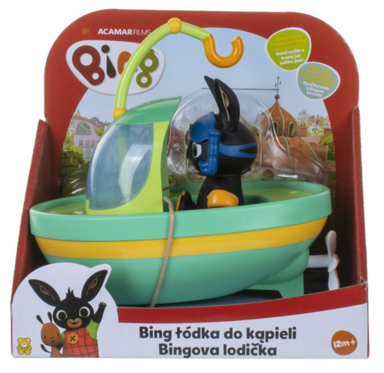 Wraz z Bingiem kąpiel stanie się wspaniałą zabawą. Nakręcana łódka Binga unosi się na wodzie. Do łódki nie potrzeba baterii. Posadź w łódce uroczego króliczka, nakręć maszt i spójrz, jak łódka sunie po wodzie! Bing ma na sobie czerwone kąpielówki, pływaczki i okulary do pływania, a w dodatku z jego rurki do nurkowania tryska woda!