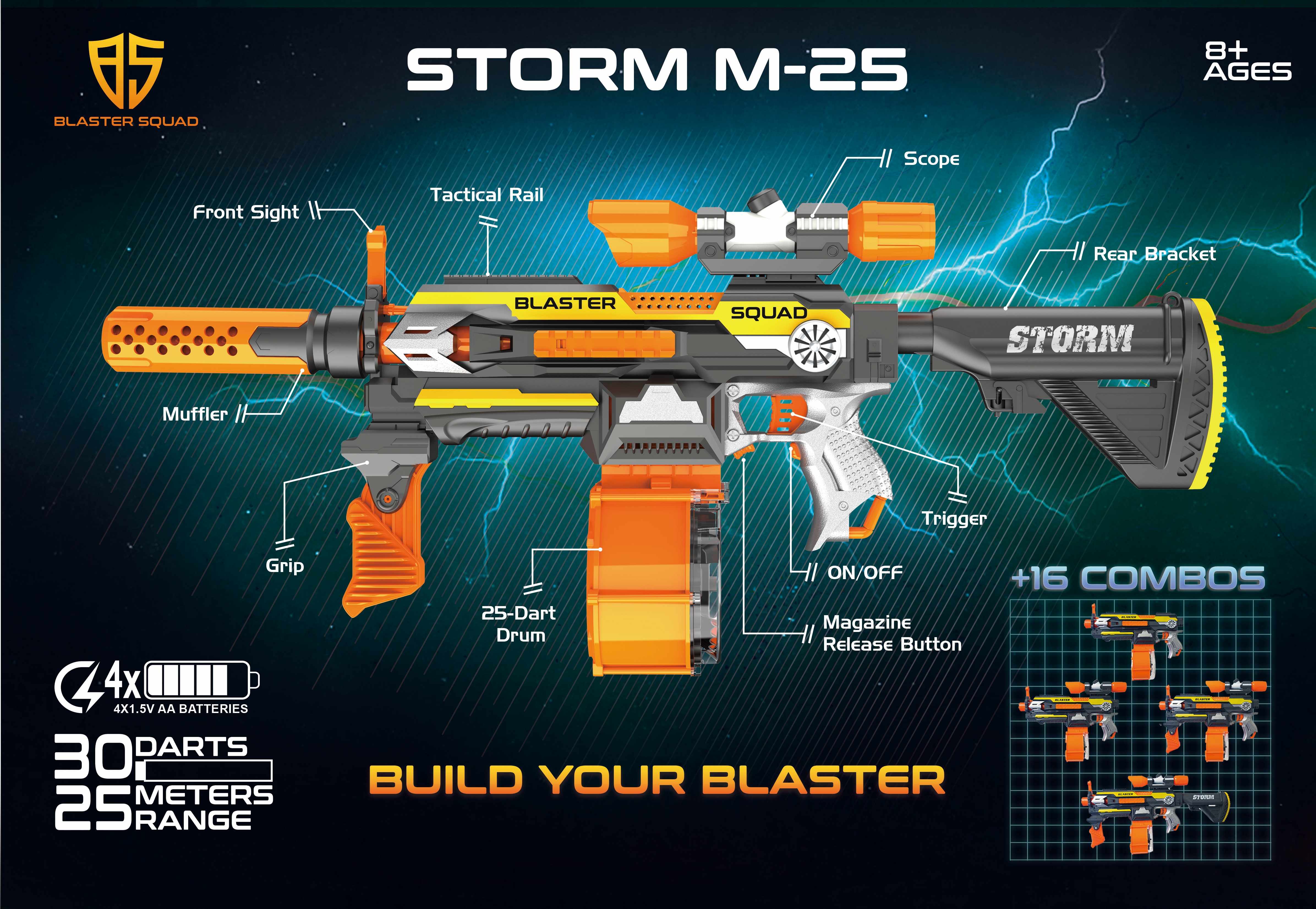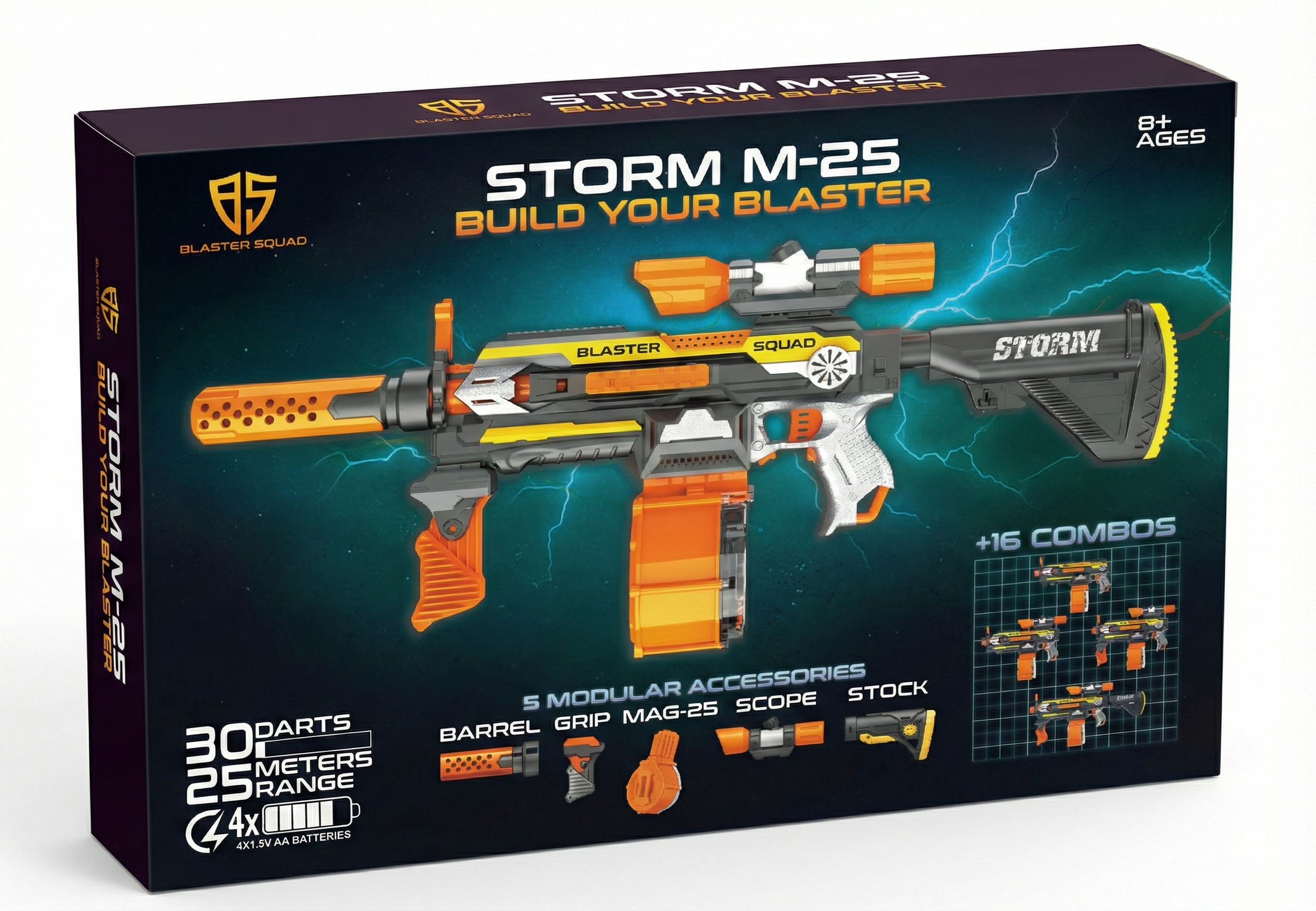 Gotowy na akcję? Blaster Squad to automatyczna wyrzutnia dla młodych wojowników — szybka, celna i mega zasięg! W zestawie znajdziesz zestaw mega dodatków: celownik, kolba, lufa i magazynek na 25 strzałek. Karabin jest łatwy w obsłudze, a co najlepsze w zestawie znajdziesz mega zestaw dodatków, które pasują również donnych wyrzutni popularnych marek.