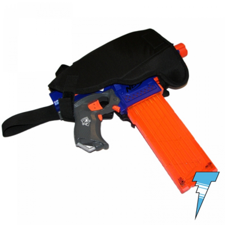 Uniwersalny uchwyt na wiele wyrzutni. Dzięki licznym możliwością dopasowywania możesz teraz w wygodny i bezpieczny sposób nosić swoja ulubioną wyrzutnie. Wystarczy przypiąć kaburę za pomocą regulowanych pasków do uda oraz szlufki do paska i gotowe. Jego największą zaleta jest oczywiście uniwersalność. Dzięki rozkładanej formie pasuje do wyrzutni: Nerf Maverick, Strongarm, Recon, Retaliator, Stryfe, Roughcut, Stockade, Barricade i wielu innych.