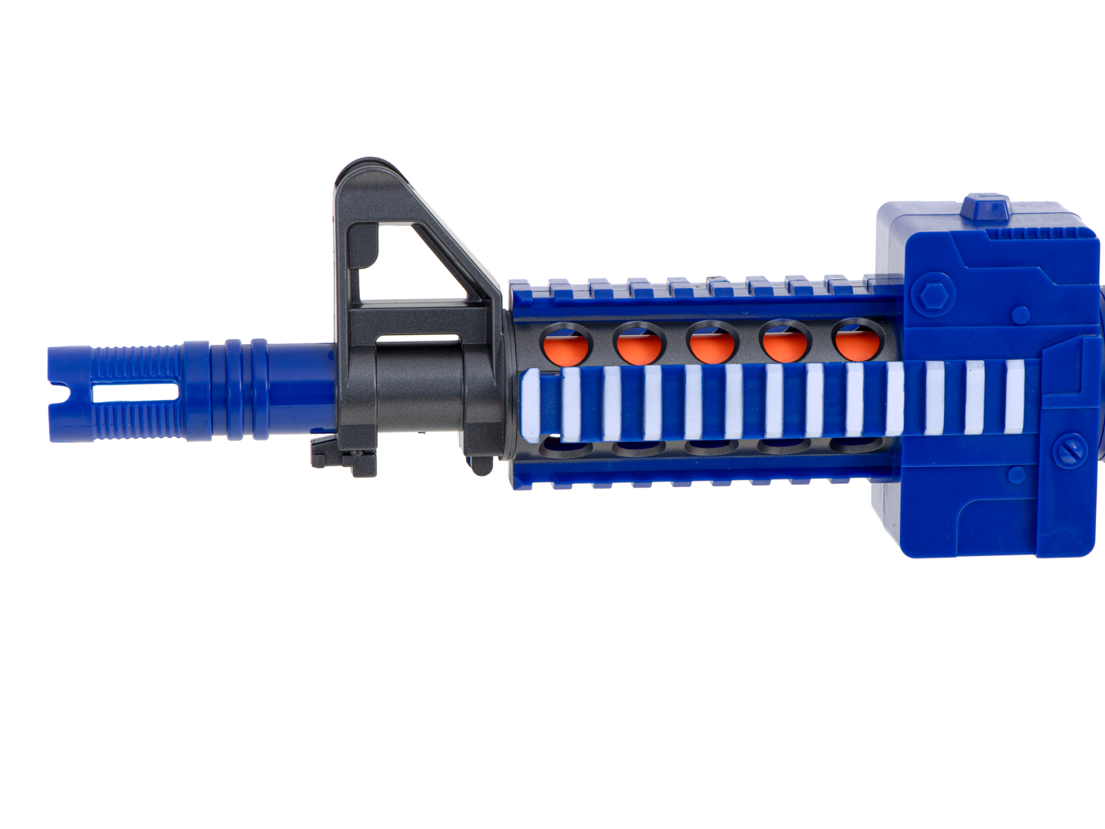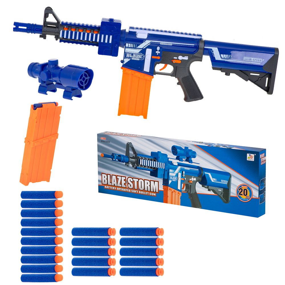 Karabin automatyczny Blaze Storm to wyrzutnia idealna dla początkujących fanów militariów. Chłopacy, którzy uwielbiają strzelanki w grze komputerowej będą mogli poczuć dreszczyk emocji w realu strzelając do celu lub w bitwie z kolegami. Wyrzutnia jest półautomatyczna. By oddać strzał wystarczy przełączyć tryb na on i pociągnąć za spust oddając pojedynczy strzał. Karabin zasilany jest bateriami, które znajdują się w kolbie. Wyrzutnia mimo, że przypomina karabin maszynowy jest lekka i prosta w użytkowaniu. W zestawie mamy 20 strzałek kompatybilnych ze strzałkami Nerf (10 strzałek jak Elite i 10 z przyssawką). Oddaje strzał nawet na 15 metrów.