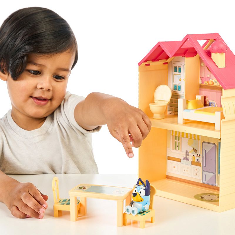 Odtwarzaj ulubione sceny z serialu i zabaw się w dom z Bluey. Drzemka w sypialni? Przekąska w kuchni? A może siusiu w łazience? Trzy pomieszczenia do zabawy, w których Bluey może spędzać czas. W oddzielnych pokojach znajdzie się sporo miejsca dla Bluey i jej rodziny. Zdobądź całą kolekcję figurek Bluey Rodzinka, aby jeszcze bardziej urozmaicić rozrywkę w domu rodzinnym!