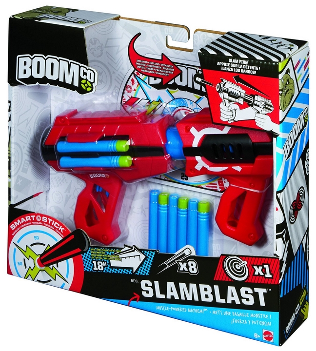 Blasterem Slamblast™ możesz strzelać rzutkami najszybciej, jak potrafisz, na odległość do 18 metrów! Sprawdź swoją własną siłę! W uchwytach i bocznych zasobnikach blastera Slambast™ mieści się do 8 rzutek Smart Stick™, a wbudowana szyna pozwala doczepiać akcesoria BOOMCo.™. Wraz z blasterem Slamblast™ dostarczana jest samoprzylepna tarcza Smart Stick™, dzięki której możesz stworzyć własną strefę BOOMCo.™!