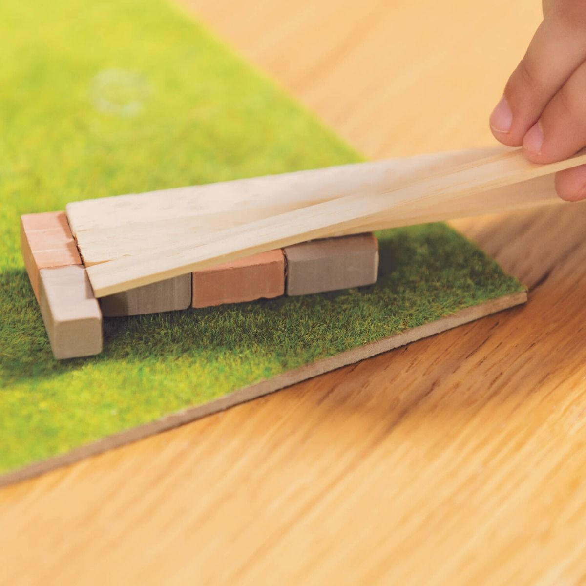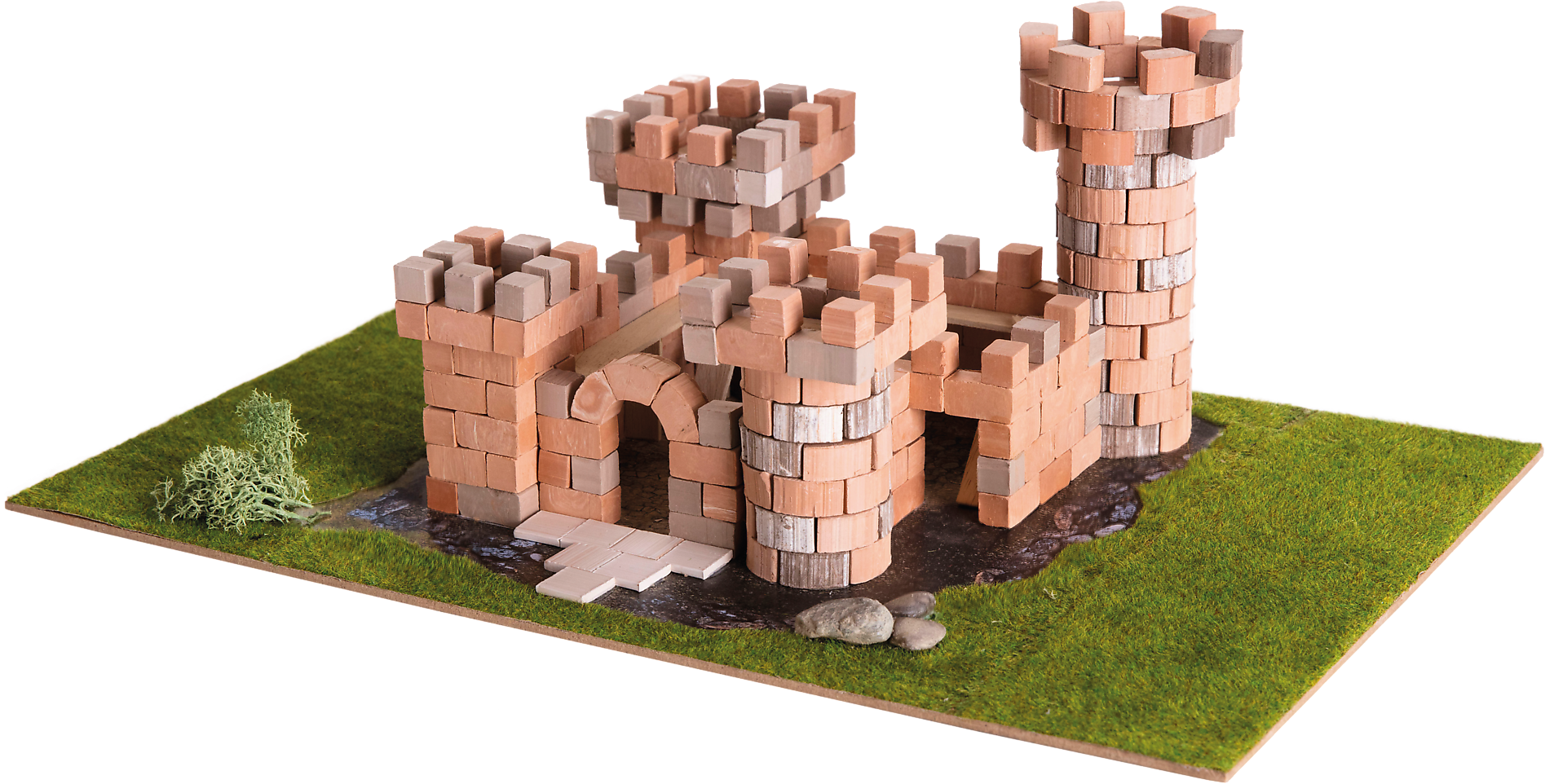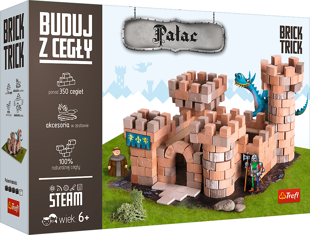 Zestaw składa się z ponad 350 elementów 100% naturalnej cegły, deseczek, podstawy oraz kartonowych pionków i akcesoriów (m.in. mnich, rycerz czy smok). Umożliwi zbudowanie makiety średniowiecznego pałacu od podstaw! Dziecko będzie mogło układać cegiełki, docinać i kleić deseczki oraz dekorować swoją wspaniałą budowlę. Załączone kartonowe pionki i akcesoria sprawią, że budynek będzie wyglądał jeszcze bardziej realistycznie.