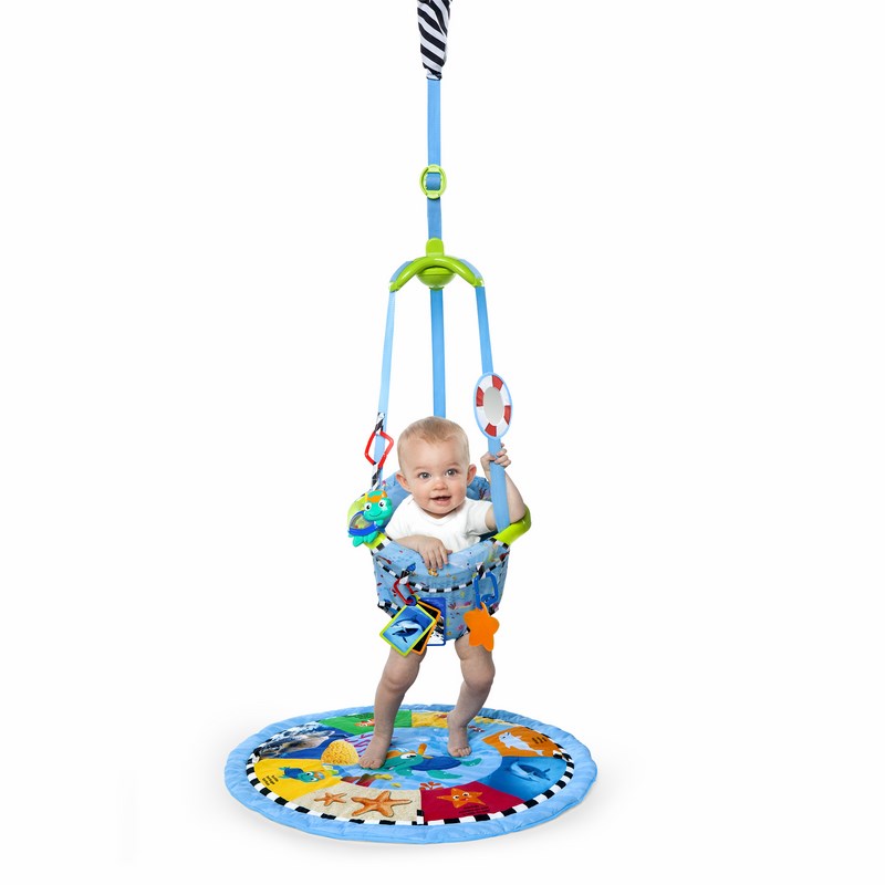 Rozpocznij zabawę z podwodnym światem Baby Einstein. Skoczek z matą jest doskonałym połączeniem do podskakiwania dla maluszka. Do zestawu dołączona jest także wygodna poduszeczka, która podpiera plecy mniejszego dziecka przebywającego w skoczku, ale jest także idealna do zabawy i gimnastyki na macie. Miękka mata oprócz dodatkowych wrażeń dotykowych podczas podskakiwania posłuży jako odrębna zabawa dla malucha.