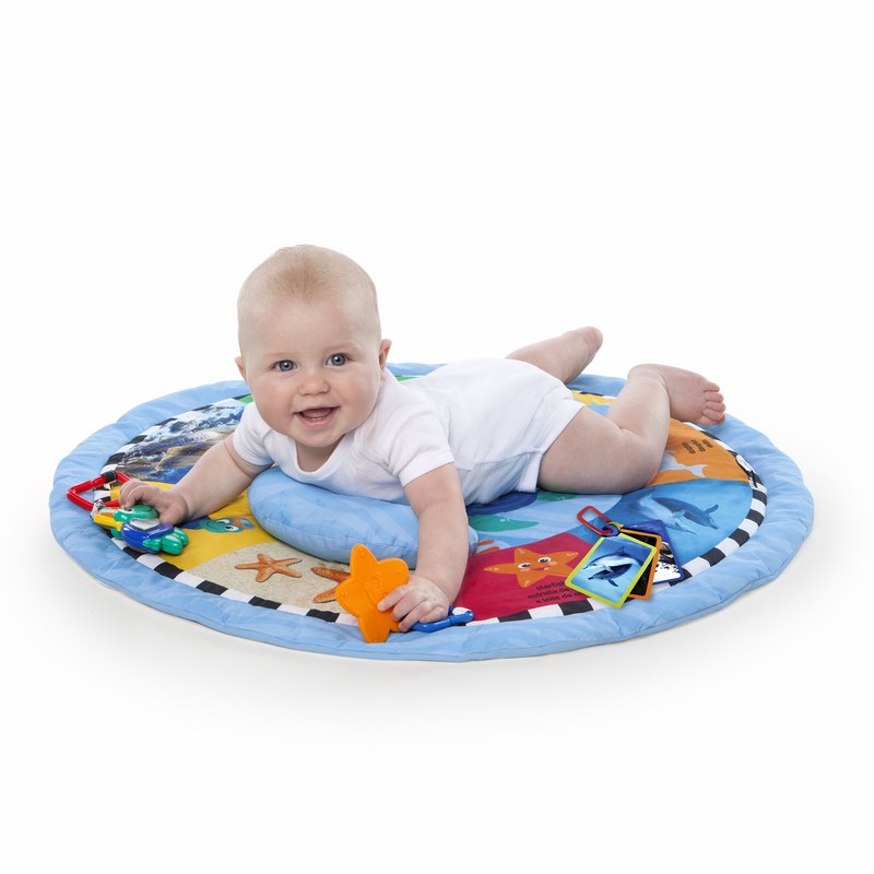 W zestawie znajdują się także mniejsze zabawki, które uatrakcyjnią zabawę i posłużą do poznawania świata – gryzak w kształcie rozgwiazdy, grzechotka żółwik, miękkie i szeleszczące karty oraz bezpieczne lusterko.