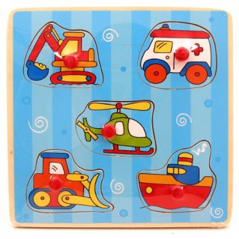 Pojazdy to drewniana układanka edukacyjna, która rozwija i kształtuje wyobraźnie, zdolność kojarzenia i zdolności manualne dziecka. Dzięki temu, że pojazdy są jednocześnie puzzlami, dzieci uczą się dopasowywania kształtów. Dodatkowo koparka, helikopter, statek, spychacz i karetka pomalowane są żywymi barwami co pozwala na naukę kolorów.