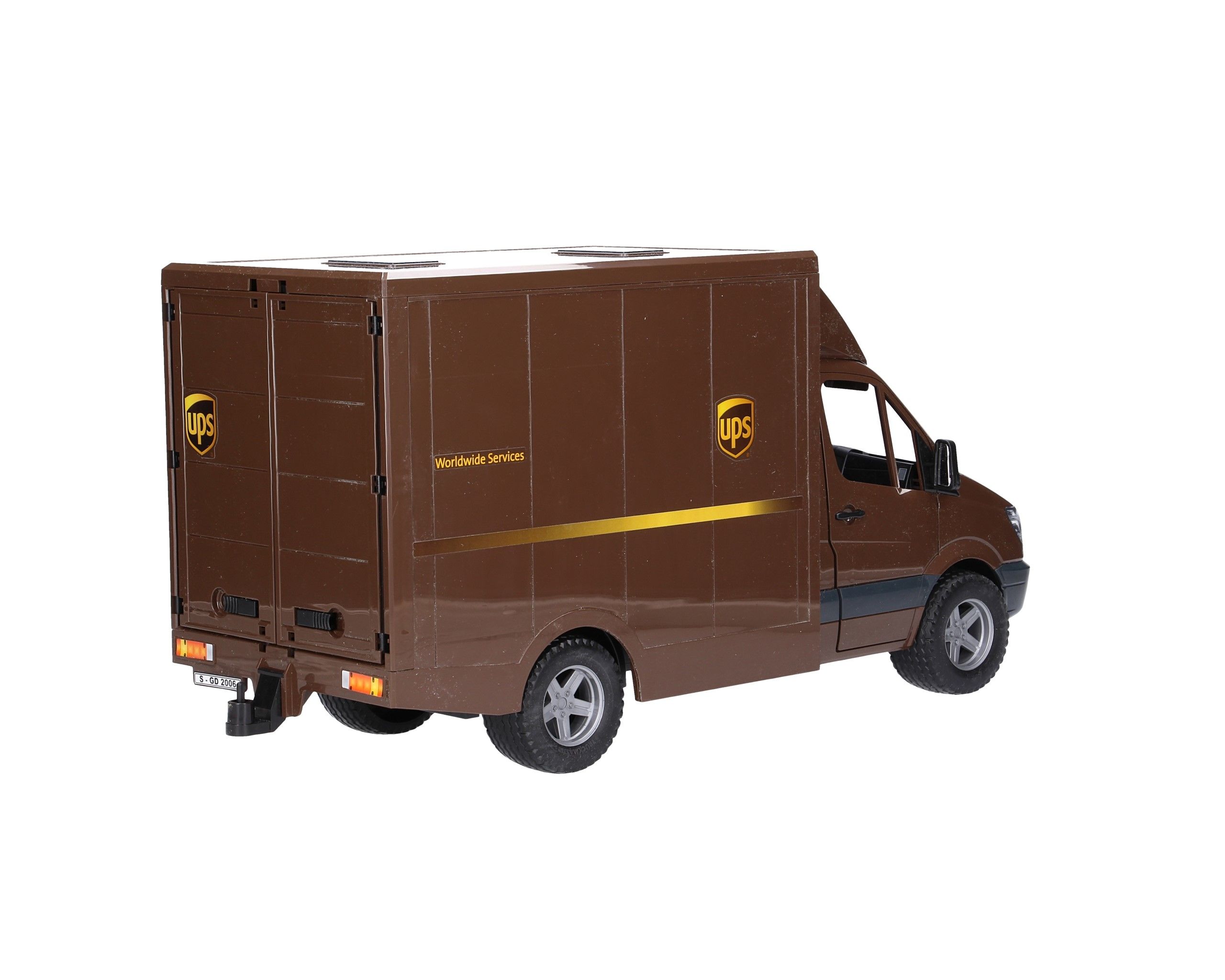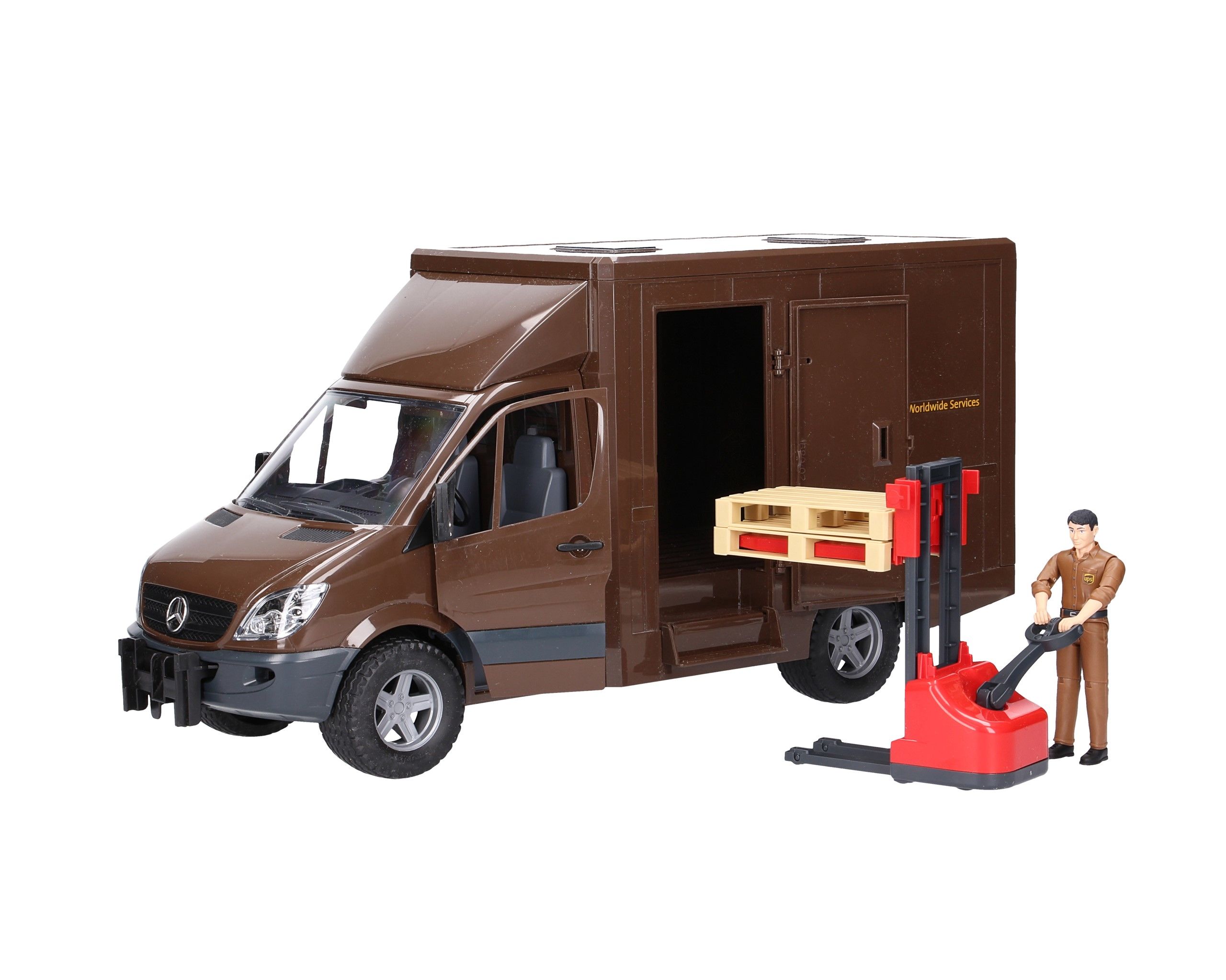 Bruder Mercedes-Benz samochód kurierski UPS + kierowca + podnośnik 02538 modele niemieckiej firmy Bruder to niezwykle realistyczne odwzorowania różnych, oryginalnych pojazdów i maszyn. Każdy z nich wykonany jest z wysokiej jakości plastiku, dodatkowo wykończony elementami gumowymi.