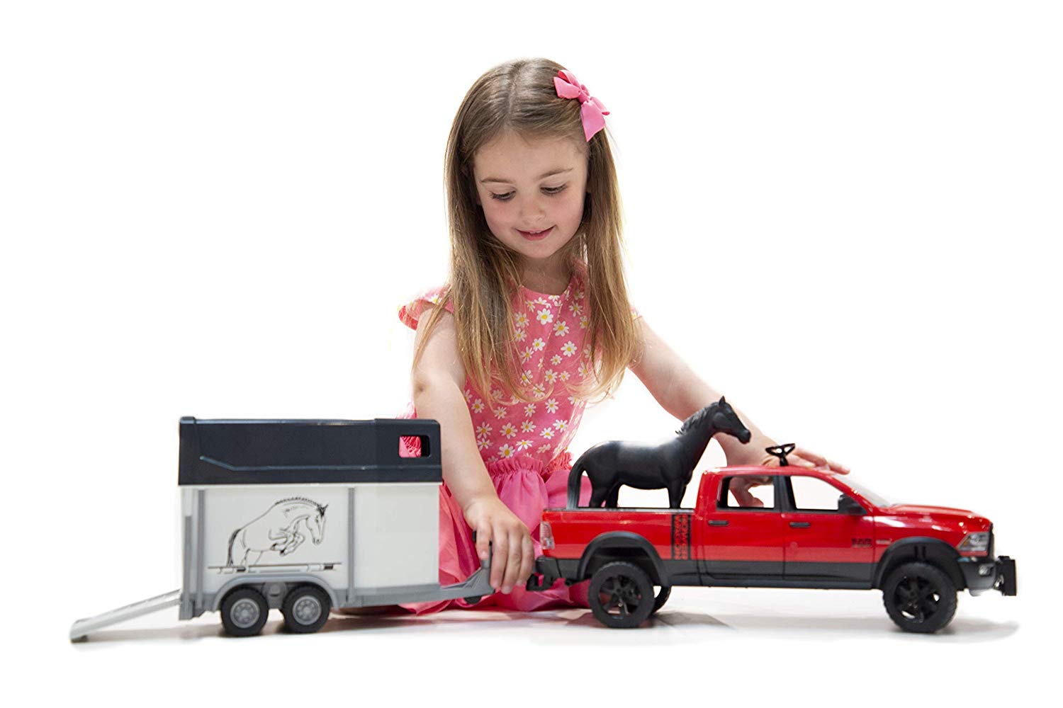 Bruder Pick-up RAM 2501 Power Wagon z przyczepą do przewozu konia 02536 modele niemieckiej firmy Bruder to niezwykle realistyczne odwzorowania różnych, oryginalnych pojazdów i maszyn. Każdy z nich wykonany jest z wysokiej jakości plastiku, dodatkowo wykończony elementami gumowymi.