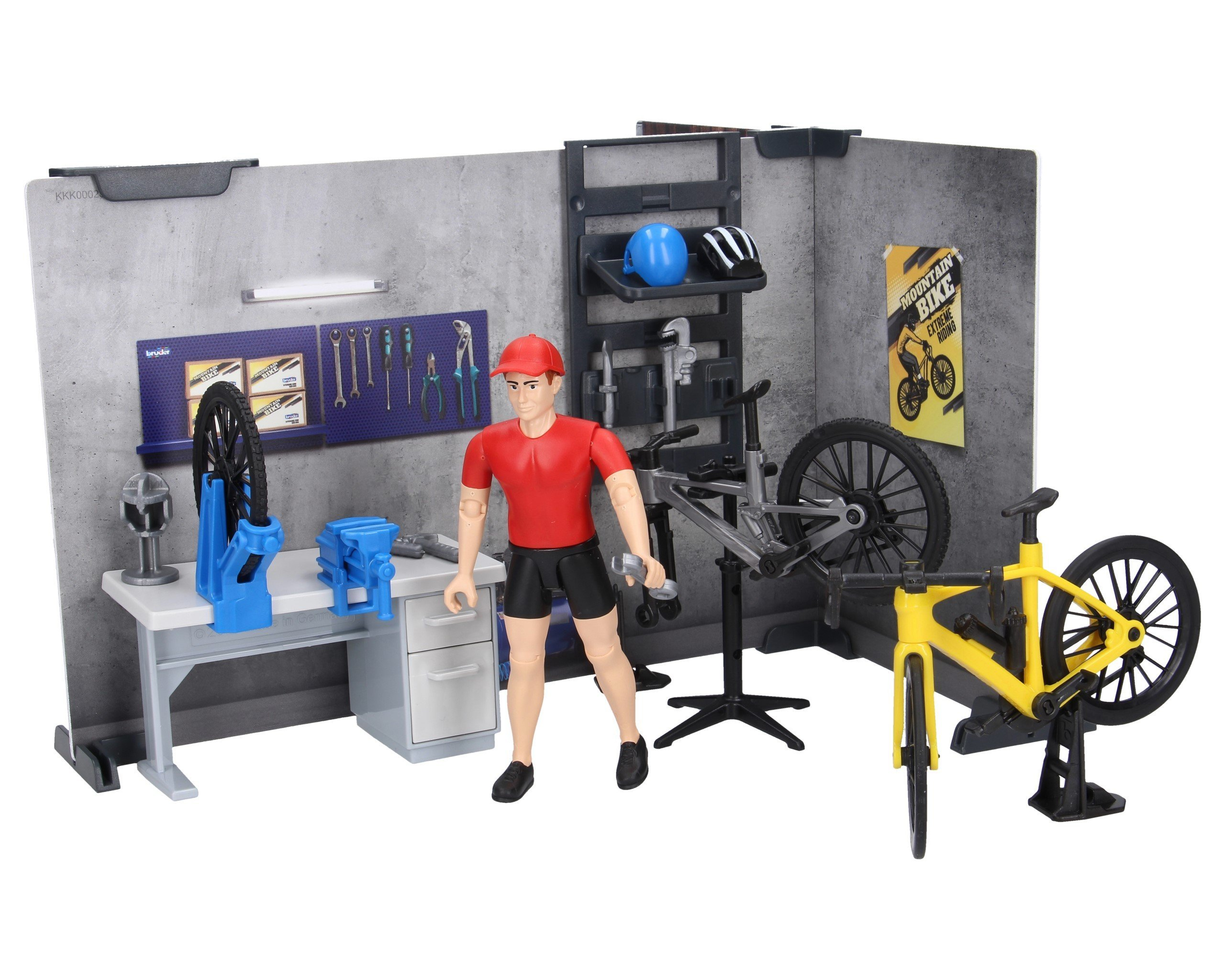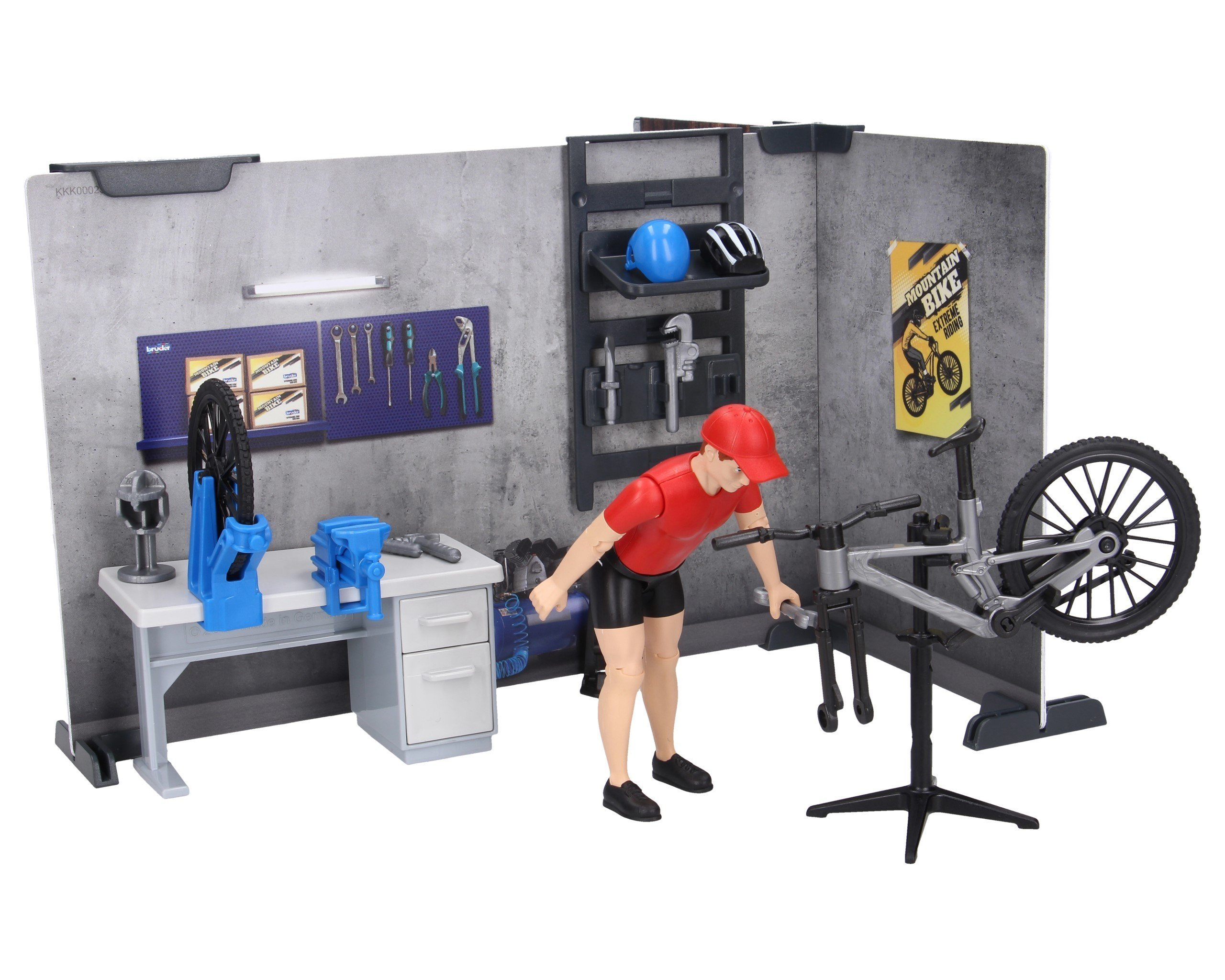 Sklep rowerowy 63120 to kolejna propozycja firmy bruder. Model, który został wykonany z najwyższą starannością przedstawia sklep rowerowy, który w swojej ofercie posiada również akcesoria dla rowerzystów. Po drugiej stronie ściany znajduje się pomieszczenie w którym odbywają się naprawy zepsutych rowerów. Nad całym sklepem czuwa dzielny pracownik, który zawsze służy pomocą.