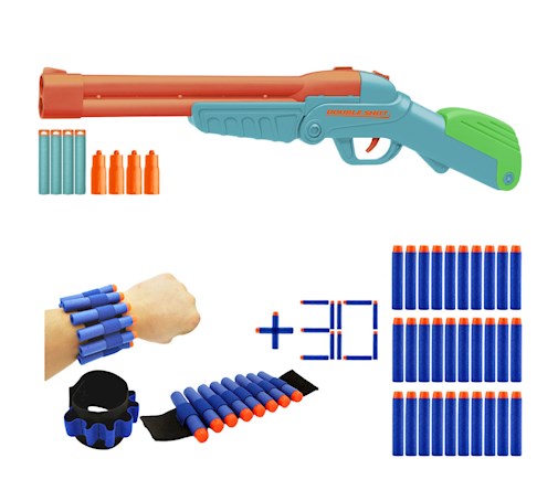 Air Warriors Double Shot przypomina kultową dubeltówkę. Długa, podwójna lufa to jedna z podstawowych cech naszej strzelby. Dubeltówkę wyróżnia sposób załadowania amunicji- by ją załadować musimy zgiąć lufę, przesuwając przycisk, który pozwala na jej odblokowanie i załadować w dwie komory specjalne łuski, które wcześniej napełniliśmy strzałkami. Teraz zostaje nam znów złączyć lufę z rękojeścią i poprzez naciśnięcie na spust oddać strzał. Każdorazowe naciśnięcie na spust powoduje oddanie kolejnego strzału. Jeżeli jednak chcemy oddać podwójny strzał, musimy mocniej pociągnąć za spust i do samego końca. Kolejną ciekawostką, która wiąże się z obsługą strzelby jest jej ponowne załadowanie. Postępujemy jak za pierwszym razem z tym, że trzeba uważać, gdyż łuski, które zostały w komorach przy otwieraniu dosłownie wyskakują z nich.