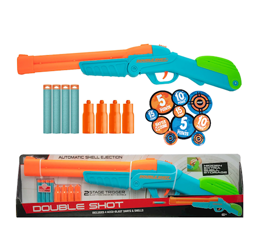 Air Warriors Double Shot przypomina kultową dubeltówkę. Długa, podwójna lufa to jedna z podstawowych cech naszej strzelby. Dubeltówkę wyróżnia sposób załadowania amunicji- by ją załadować musimy zgiąć lufę, przesuwając przycisk, który pozwala na jej odblokowanie i załadować w dwie komory specjalne łuski, które wcześniej napełniliśmy strzałkami. Teraz zostaje nam znów złączyć lufę z rękojeścią i poprzez naciśnięcie na spust oddać strzał. Każdorazowe naciśnięcie na spust powoduje oddanie kolejnego strzału. Jeżeli jednak chcemy oddać podwójny strzał, musimy mocniej pociągnąć za spust i do samego końca. Kolejną ciekawostką, która wiąże się z obsługą strzelby jest jej ponowne załadowanie. Postępujemy jak za pierwszym razem z tym, że trzeba uważać, gdyż łuski, które zostały w komorach przy otwieraniu dosłownie wyskakują z nich.
