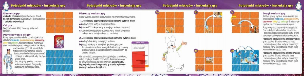 Gra quizowa „Pojedynki mistrzów” to znakomita okazja do sprawdzenia wiedzy na temat ludzkiego organizmu. Gracz sam decyduje, czy będzie odpowiadał na łatwe, czy trudne pytania. Odpowiadając na pytania łatwe, gracz kompletuje jeden z wybranych układów. Jeżeli udzieli poprawnej odpowiedzi na trudne pytanie, może wówczas pomieszać szyki jednemu z przeciwników. Zwycięża ten, który pierwszy dopasuje elementy swojej układanki - zostaje mianowany Mistrzem, a zdobyta wiedza na pewno przyda się w kolejnych pojedynkach.