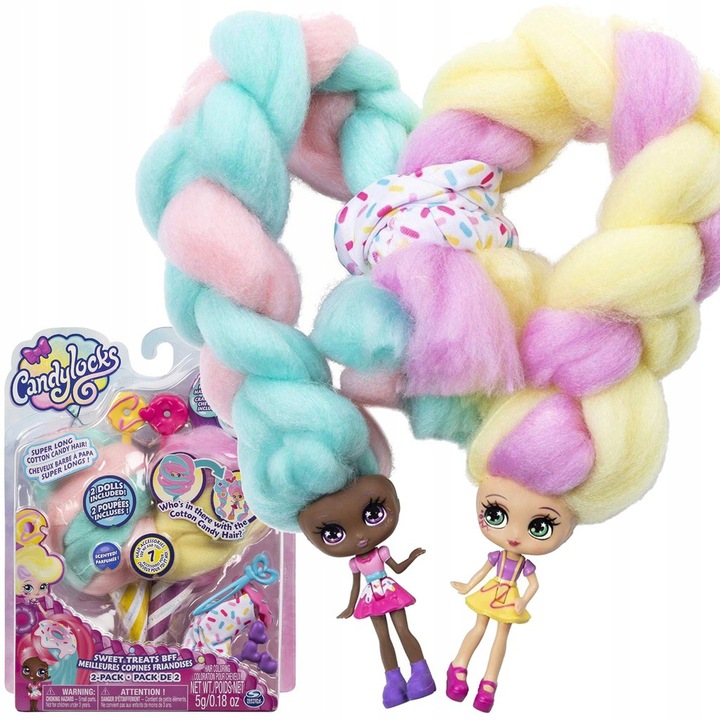 Zestaw Candylock 2 x lalka niespodzianka pochodzi z najnowszej serii lalek o długich i pachnących włosach od marki Spin Master. Lalki są ukryte wewnątrz włosów przypominających watę cukrową.