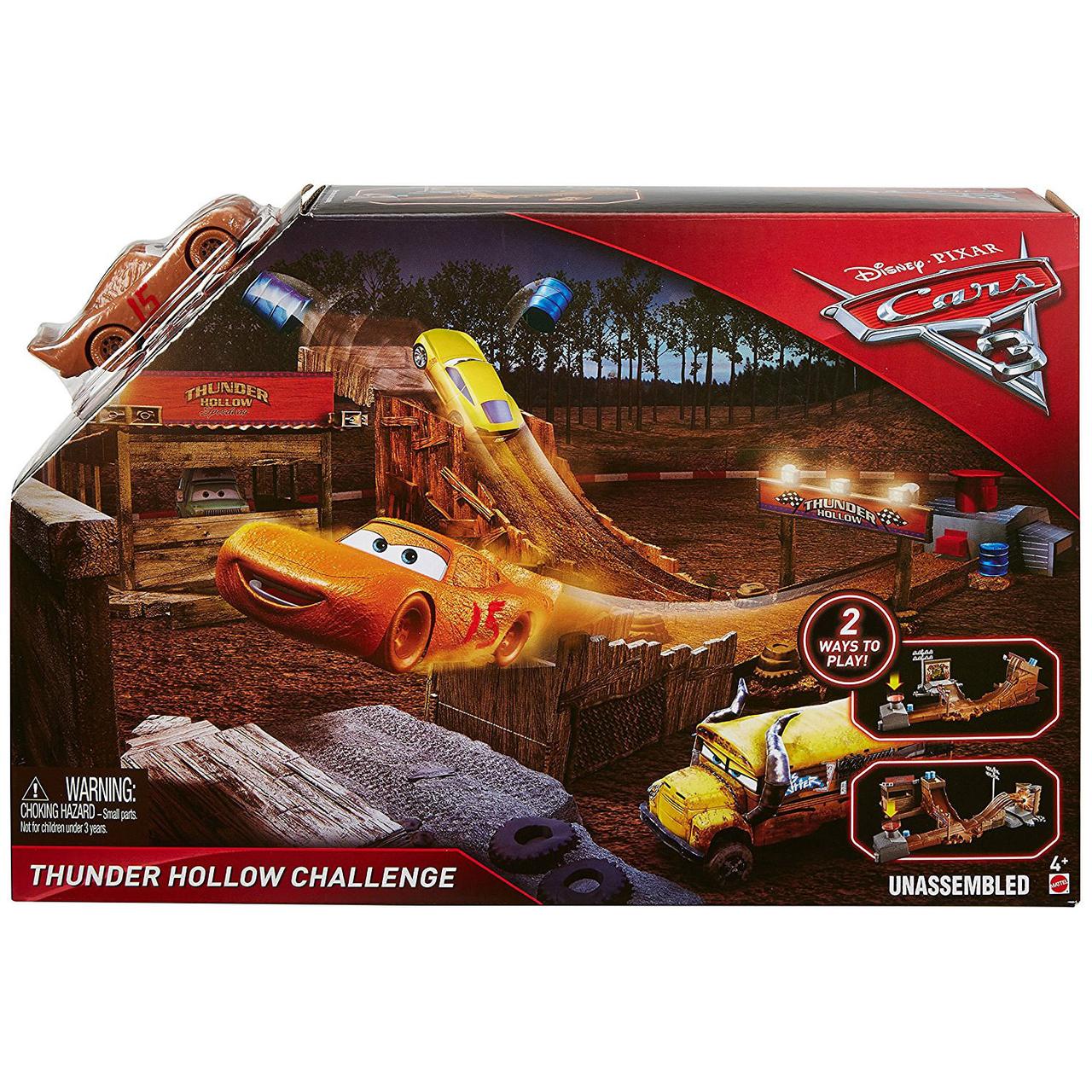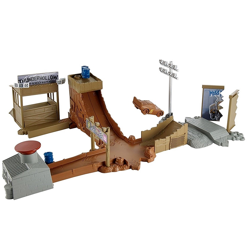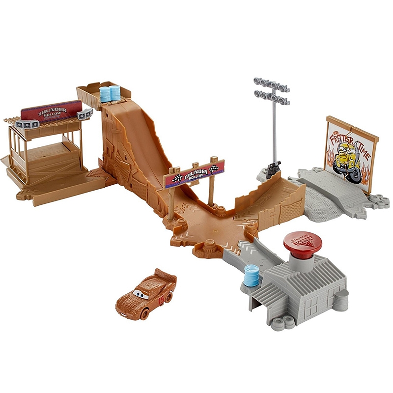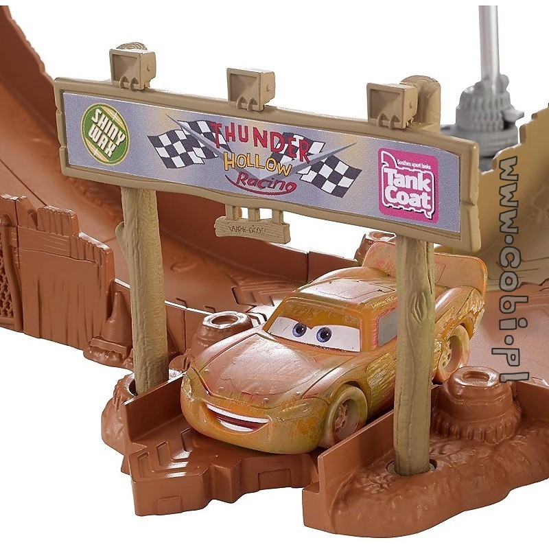Szykuj się na wartką akcję i kaskaderskie popisy dzięki zestawom do zabawy zainspirowanym filmem Auta 3 produkcji Disney Pixar. Kultowe motywy z filmów, szalone wyrzutnie, wyścigi równoległe i kaskaderskie wyskoki na jednym torze! Wybierz jedno ze znanych filmowych miejsc. W zestawie od firmy Mattel znajdują się tory do konfiguracji, które po złożeniu do złudzenia przypominają miejsce jednego z ważniejszych wyścigów w trzeciej części filmu Auta. Zabawa jest możliwa na dwa różne sposoby. Znajdziemy tu dwie wyrzutnie uruchamiane dużym, czerwonym przyciskiem, budkę dla komentatorów sportowych i podium. Zestaw jest wyposażone w różne akcesoria- m.in. tematyczne tabliczki z napisami czy reflektory. Do dyspozycji mamy autko Zygzak McQueen w ubłoconej, brązowej wersji, z wymalowanym czerwonym numerem „15” na boku. Po torach mogą poruszać się także inne autka z serii Mattel Auta 3, które są sprzedawane oddzielnie. Precyzyjnie zaprojektowany i wykonany tor gwarantuje te same fantastyczne przygody, co podczas oglądania animacji.