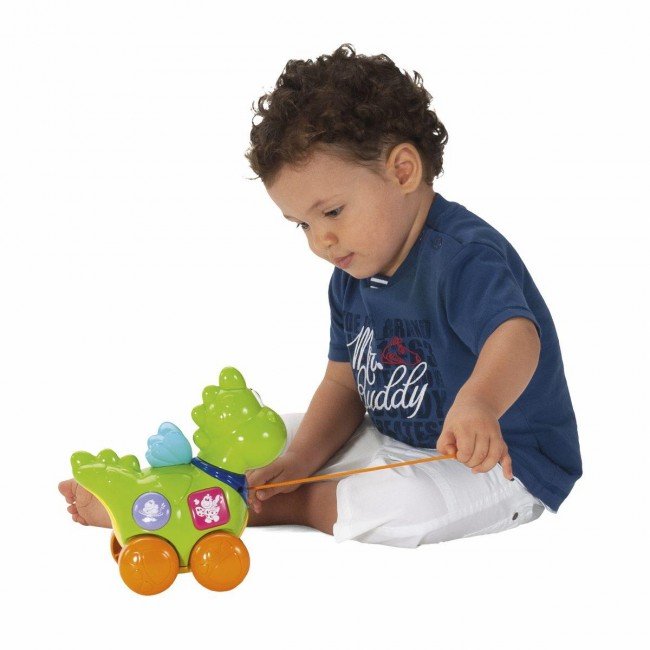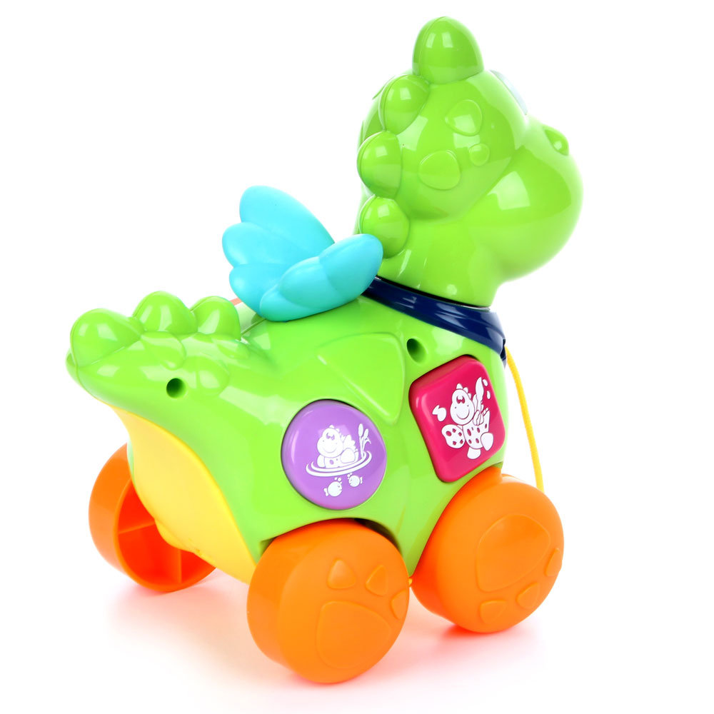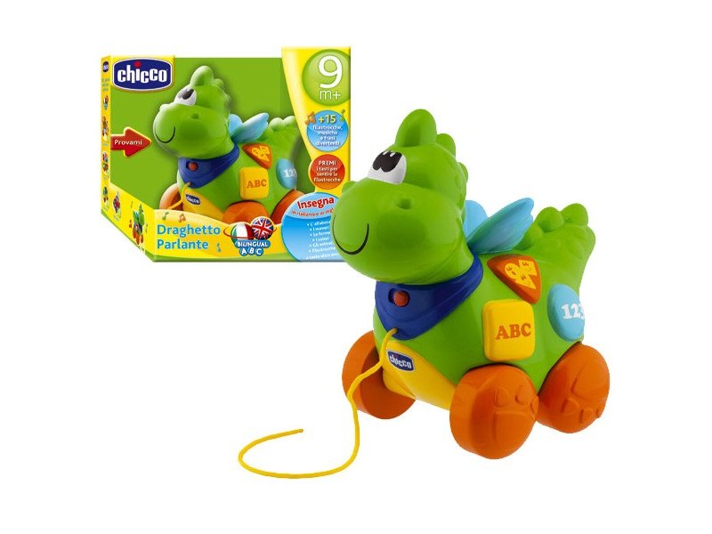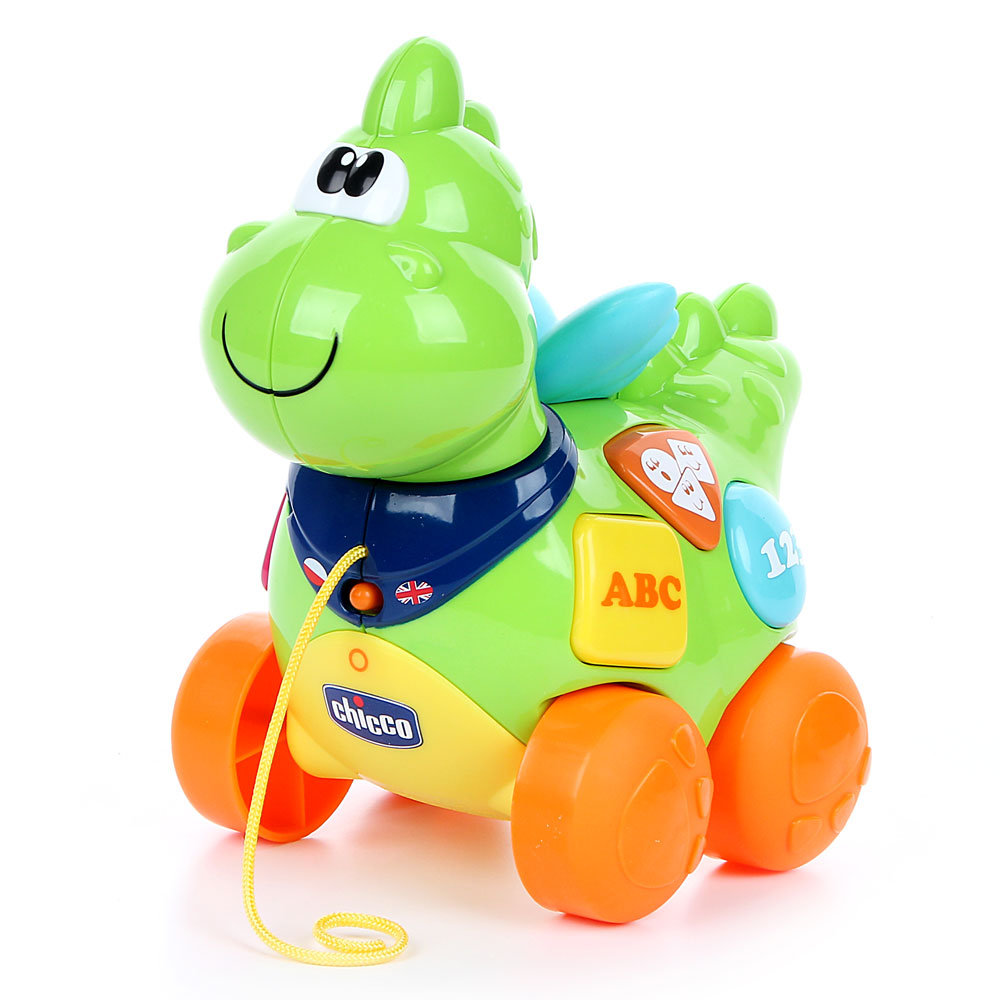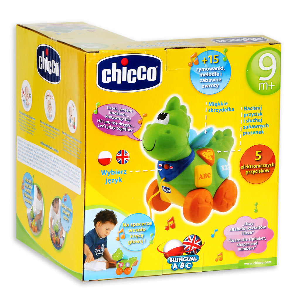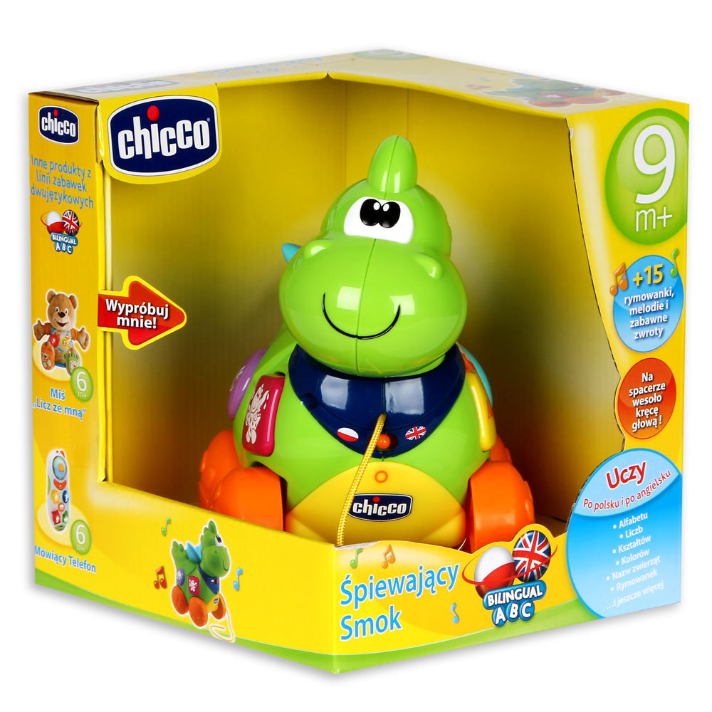 Śpiewający smok to idealny przyjaciel podczas pierwszych spacerów dziecka. Kiedy pociąga się go za sznurek kiwa radośnie głową w prawo i lewo. Naciskając kolorowe przyciski na brzuszku smoka dziecko słyszy 10 różnych, zabawnych rymowanek, dzięki którym poznaje alfabet, liczby, kształty, kolory i nazwy zwierząt w języku polskim i angielskim.