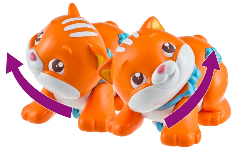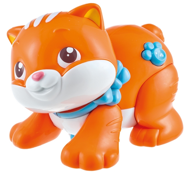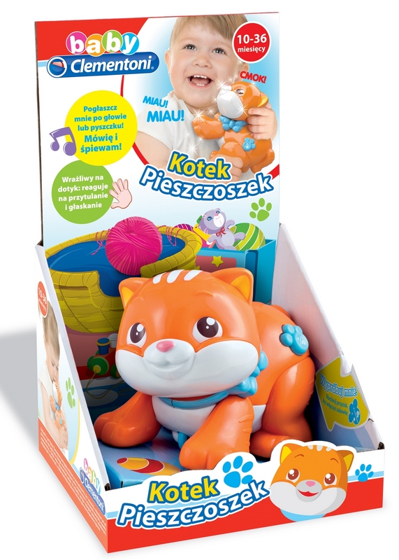 Mówiący i interaktywny kociak po pogłaskaniu po pyszczku i po głowie, mówi i śpiewa dzięki dwóm klawiszom “touch” czułym na dotyk. Rozwija percepcję wzrokową i słuchową. Stymuluje rozwój uczuciowy dzięki zabawnym piosenkom i rymowankom. Głowa obraca się mechanicznie. Kotek porusza się na 3 kołach umieszczonych w podstawie, po wprawieniu ich w ruch, mówi i śpiewa.