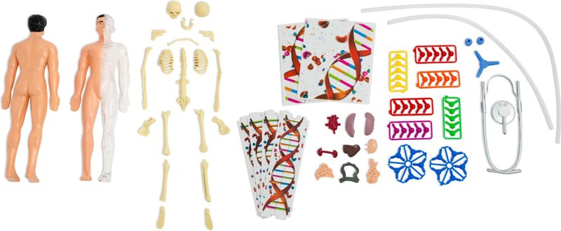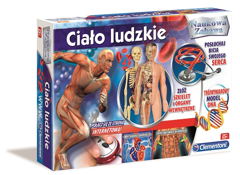 Clementoni Ciało ludzkie to zestaw, który pozwoli odkryć Ci co się dzieje wewnątrz ludzkiego ciała i poznać jego anatomię. Zawiera realistyczny model, którego narządy wewnętrzne są wyjowane! W zestawie znajdziesz także stetoskop, który pozwoli Ci posłuchać bicia własnego serca oraz trójwymiarowy model DNA. Dodatkowo zestaw zawiera aplikację internetową umożliwiającą dostęp do strony internetowej, gdzie dostępne są liczne trójwymiarowe obrazy i animacje przedstawiające m.in. schemat przepływu krwi.