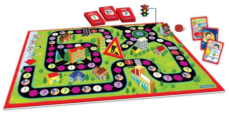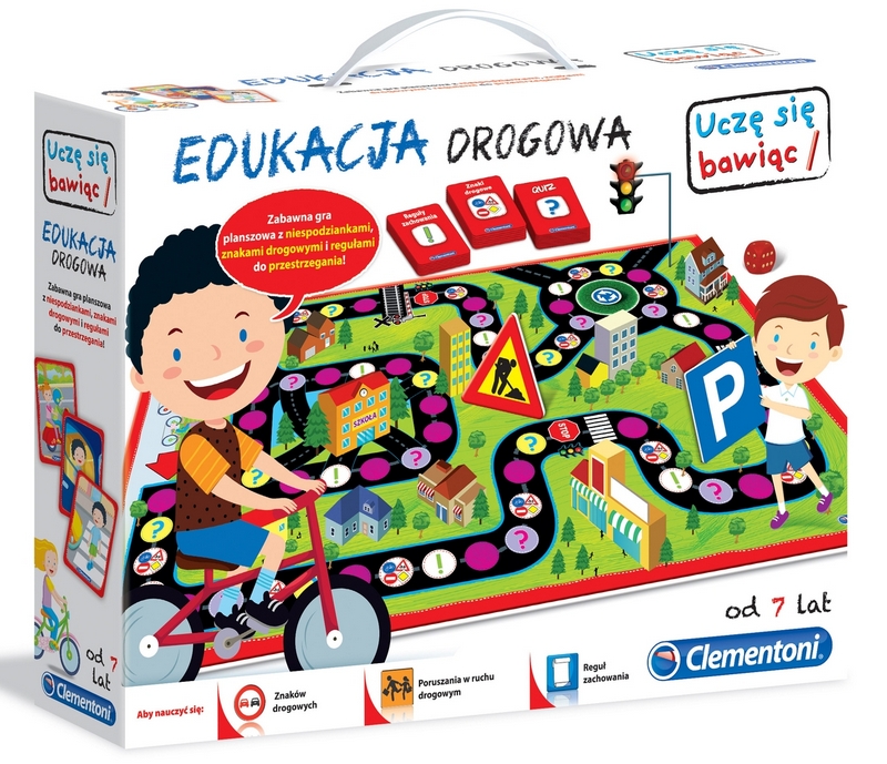 Edukacja drogowa to zabawna gra planszowa z niespodziankami, znakami drogowymi i regułami do przestrzegania! Dzieci przesuwają pionki po planszy i zależnie od tego na jakie pole trafią, odpowiadają na sympatyczne pytania, obserwują zachowania na obrazkach i rozpoznają znaki drogowe. Gracz, który jako pierwszy dotrze z domu do szkoły, wygrywa. Komu w drogę temu czas!