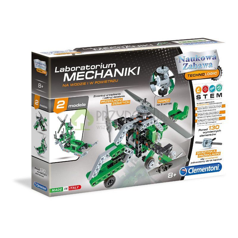 Laboratorium Mechaniki na wodzie i w powietrzu to zestaw młodego mechanika, który chce poznać tajniki konstrukcji dwóch pojazdów: ze śmigłami i pływającego. Pozwala odkrywać tajniki aerodynamiki. Do zestawu dołączona jest ilustrowana instrukcja, która ułatwia układanie maszyn. W skład wchodzi ponad 130 elementów wymiennych, w tym skrzynia biegów, przekładnie, śmigła, koła, czy koła zębate.