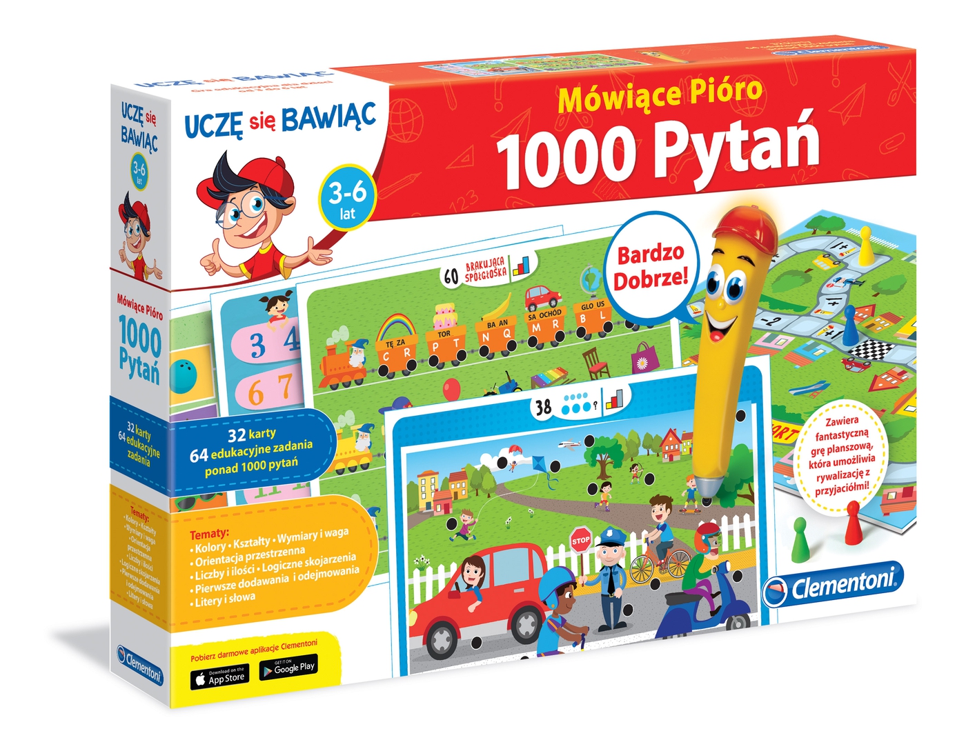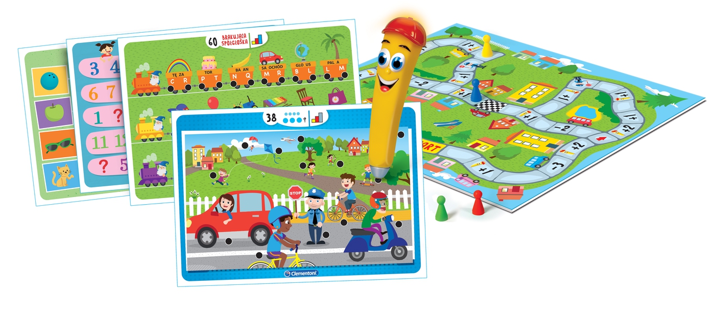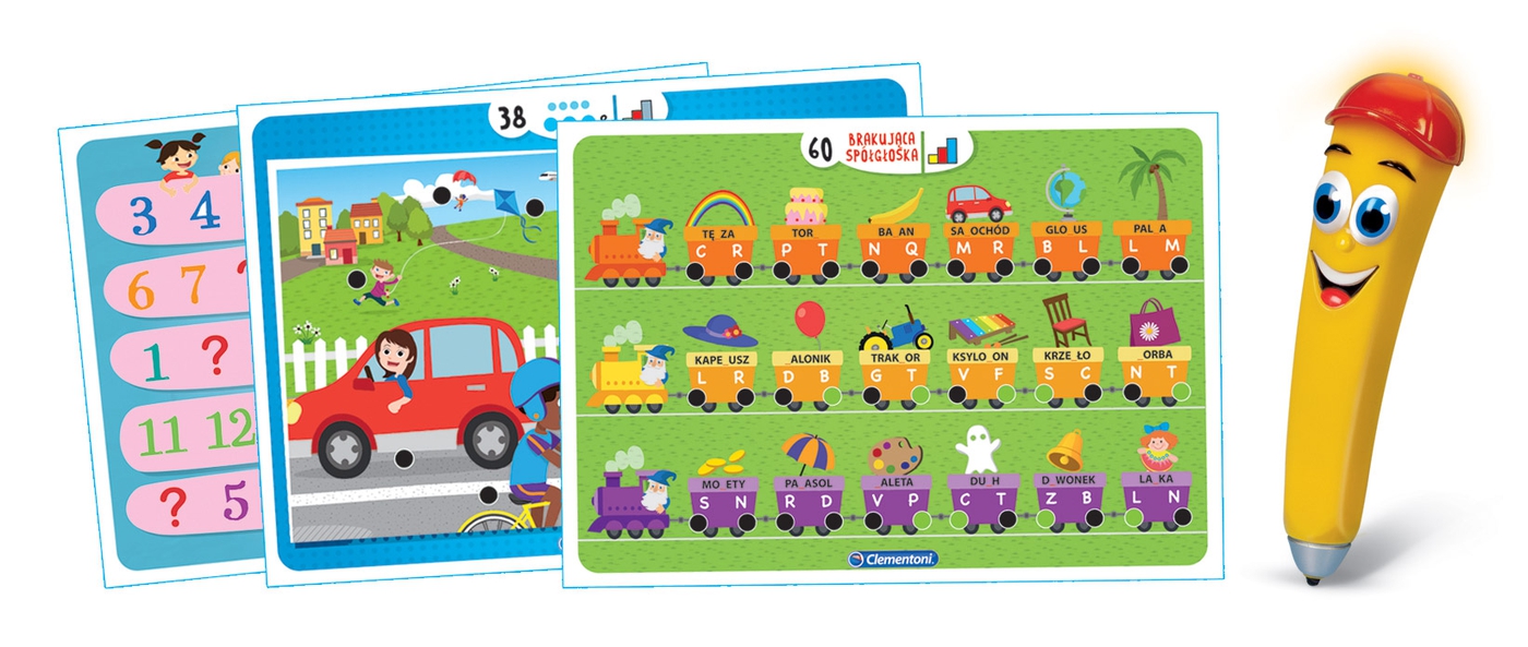 Clementoni Uczę się Bawiąc Mówiące pióro 1000 Pytań 60907 seria dla małych dzieci, która pomaga poszerzać wiedzę poprzez zabawę. To edukacyjna gra planszowa z 32 kartami i 64 zadaniami, dzieki, którym dziecko nauczy się liter, słów, licz, ilość, kształtów i kolorów. Dziecko uczy się całkowicie samodzielnie dzięki mówiącemu pióru, które prowadzi je przez grę, sygnalizując prawidłowe odpowiedzi. Można też zaprosić do gry przyjaciół i zagrać w grę planszową i rozwiązać ponad 1000 quizów.