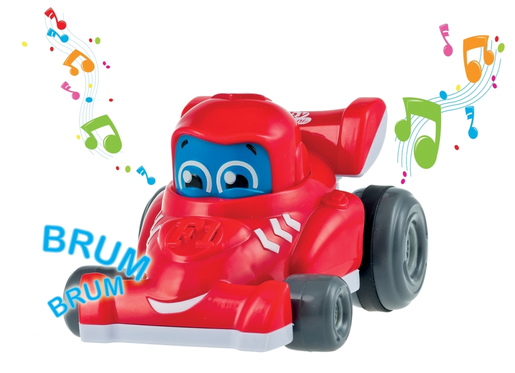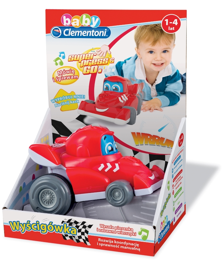 Wyścigówka to przezabawny samochodzik. Po naciśnięciu karoserii rusza z dużą prędkością, wyśpiewując przy tym wesołą piosenkę, wierszyki i śmieszne zdania. Dziecko może podąrzać za samochodem, bawić się w urządzanie szalonych wyścigów, zawodów i w rezultacie ćwiczyć koordynację, sprawność manualną, a także poznawać związki przyczynowo-skutkowe oraz uczyć się wielu nowych słów. Efekty dźwiękowe, które podkreślają poszczególne fazy ruchu: start, przyspieszenie i hamowanie.