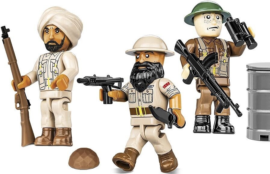 Pierwszy zestaw figurek dedykowany armii brytyjskiej! Znajdziemy tutaj przedstawicieli trzech różnych jednostek, w tym tytułowej SAS. Wszystkie figurki zostały wyposażone w nowy rodzaj nieco wyższych nóżek ze wpinanymi osobno bucikami. Każda figurka otrzymała również nowy rysunek twarzy. Najciekawszą nowością jest pierwszy kolorowy karabin Lee Enfield. Broń nie jest malowana! To dwukolorowy wtrysk z ABSu wykonany przy użyciu najnowszej zaawansowanej technologii! Otrzymał go żołnierz brytyjskiej kolonialnej piechoty indyjskiej. Charakterystyczny brodacz w mundurze tropikalnym i z pistoletem maszynowym sten to żołnierz elitarnej jednostki SAS. Zestaw uzupełnia młody żołnierz piechoty brytyjskiej z europejskiego teatru działań wojennych, wyposażony w karabin maszynowy Bren i lornetkę. Dodatkowo do zestawu zostały dołączone praktyczne podstawki pod figurki oraz elementy otoczenia.