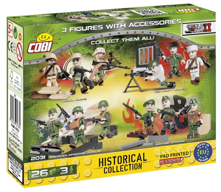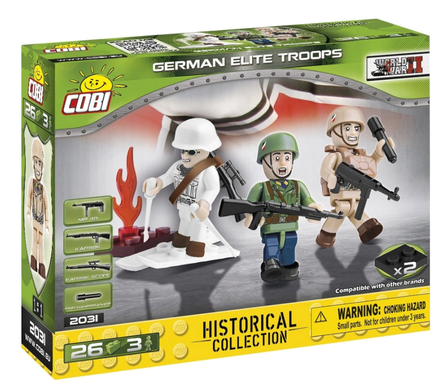 Zestaw trzech figurek żołnierzy niemieckich z okresu II wojny światowej. Każda figurka przedstawia członka innej elitarnej jednostki. W pudełku znajdziemy strzelca górskiego z nadrukiem charakterystycznej białej kurtki typu anorak. Główka posiada nowy nadruk gogli śnieżnych. Figurka została wyposażona w rzadki biały hełm, narty oraz kijki. Po raz pierwszy w ofercie COBI pojawił się gumowy pas nośny na broń długą oraz karabin snajperski z lunetą — Mauser Kar 98K. Pozostałe dwie figurki przedstawiają spadochroniarzy niemieckich w mundurze tropikalnym i zwykłym. Nadruki na torsie odwzorowują umundurowanie z okresu wojny. Zupełnie nowe główki posiadają bogatą mimikę oraz nadruk paska od hełmu. Nowością są charakterystyczne hełmy spadochronowe M38 oraz plecak spadochronowy. W pudełku znajduje się również standardowy karabin Mauser 98K, pistolet maszynowy MP40 oraz granat trzonkowy M24. Spadochroniarzy można ustawić na dołączonych do zestawu dwóch klockowych podstawkach. Całość zestawu uzupełnia dodatek w postaci klocków z elementami otoczenia, które można wykorzystać przy zabawie oraz budowie dioram.