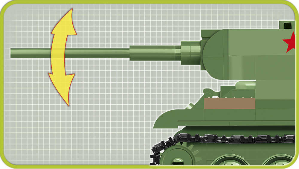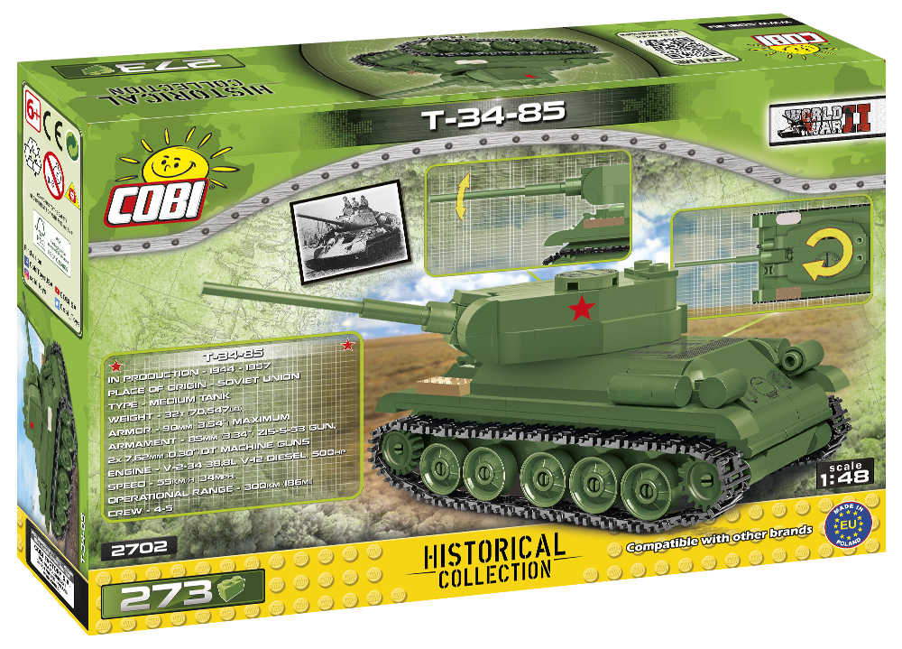 Miniaturowy pojazd z klocków konstrukcyjnych COBI został wyprodukowany w zupełnie nowej skali 1:48. Jest łatwy w budowie, idealnie nadaje się na początek przygody z polskimi klockami konstrukcyjnymi COBI. Posiada ruchome działo, obracającą się wieżę i działającą trakcję gąsienicową. Wszelkie detale graficzne są wysokiej jakości nadrukami, które nie ścierają się nawet w trakcie intensywnej zabawy. Zaletą jest konstrukcja, która w wyjątkowy sposób odzwierciedla oryginalne kształty swego historycznego pierwowzoru. Model czołgu T-34-85 znakomicie sprawdzi się jako zabawka, ale także wyjątkowy element każdej kolekcji fana militariów i broni pancernej.
