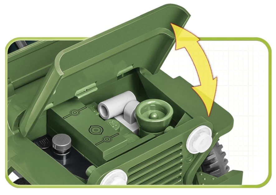 Model samochodu został wyprodukowany z polskich klocków konstrukcyjnych COBI. Charakterystyczne kształty historycznego pojazdu zostały wiernie odwzorowane przy użyciu wysokiej jakości klocków. W modelu tym zrezygnowaliśmy z naklejek. Zostały one zastąpione trwałymi nadrukami, które nie ścierają się nawet w trakcie intensywnej zabawy. Obracające się koła wyposażone w opony idealnie nadają się do poruszania modelem w trakcie zabawy. Pod uchylną maską znajduje się odwzorowany silnik, który podobnie jak wnętrze pojazdu można dowolnie modyfikować wedle swoich potrzeb. Na pace samochodu jest zainstalowany ruchomy karabin maszynowy, radiostacja oraz koło zapasowe.