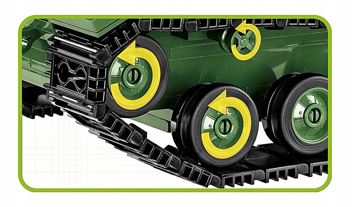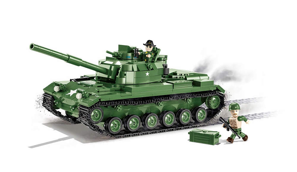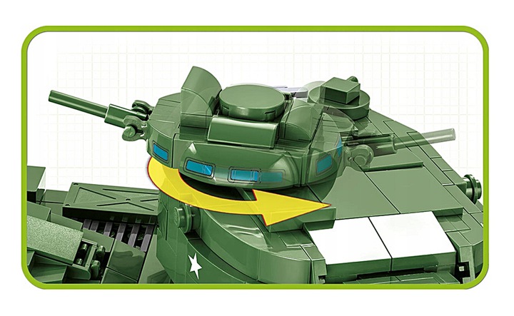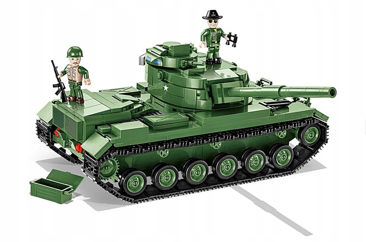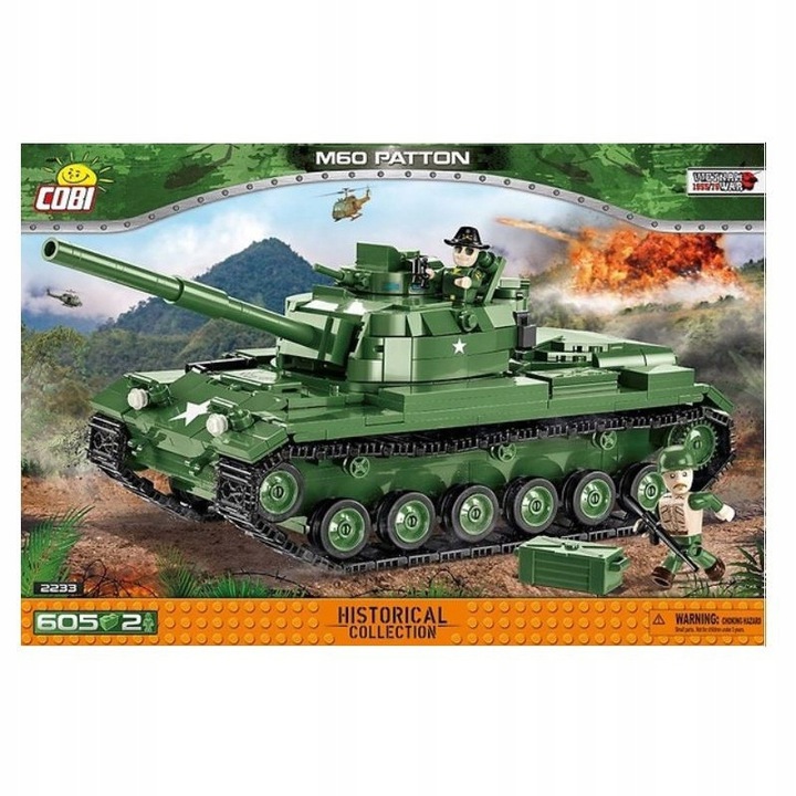 Z zestawu klocków konstrukcyjnych COBI wybudujesz dokładnie odwzorowany słynny amerykański czołg M60 Patton. Model został pokryty wysokiej jakości nadrukami, które nie zużywają się nawet w czasie intensywnej zabawy. Nadruki naśladują malowanie pojazdu z okresu wojny w Wietnamie oraz imitują detale oporządzenia. Czołg jest wyposażony w obrotową wieżę, otwierany właz, ruchomą lufę i działającą trakcję gąsienicową. Do zestawu zostały dołączone dwie figurki. Są to żołnierz amerykański w kamizelce kuloodpornej wyposażony w karabin M16 oraz oficer kawalerii powietrznej.