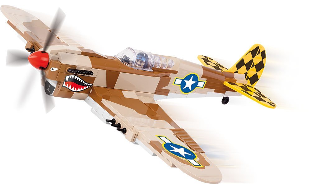 Amerykański myśliwiec z czasów II wojny światowej. Z zestawu zbudujesz klockowy model tego samolotu, z oryginalnym malowaniem z czasów II wojny, czyli z paszczą rekina zdobiącą pokaźny wlot powietrza.