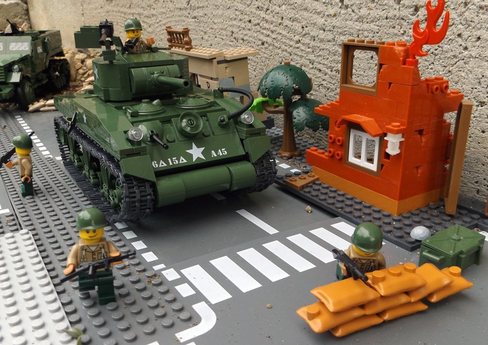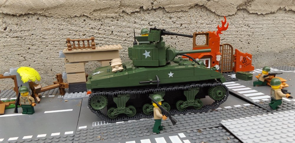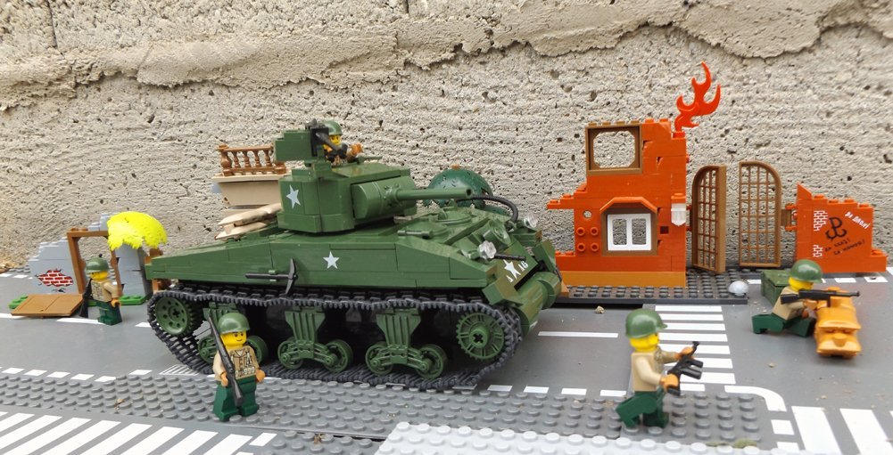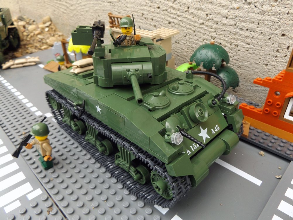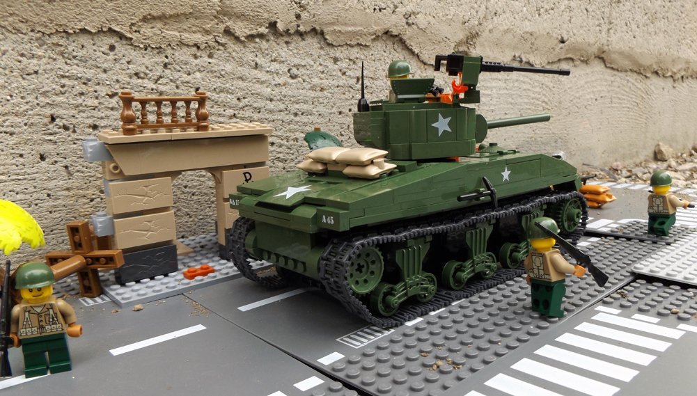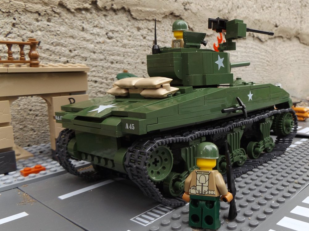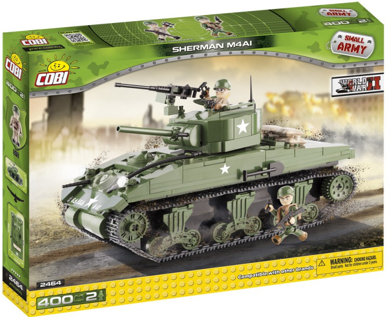 Zestaw składa się z 400 klocków, z których zbudujesz unowocześnioną wersję czołgu Sherman i dwóch dobrze uzbrojonych żołnierzy.