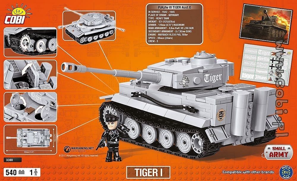 Cobi Small Army Czołg Tiger I 540 el. 3000 Small Army to seria klocków Cobi przeznaczone specjalnie dla małych strategów wojennych. Dzięki tej serii dzieci mogą budować legendarne oddziały wojskowe. Czas na fantastyczną przygodę w organizowanie manewrów na lądzie, morzu i powietrzu swojej małej armii.