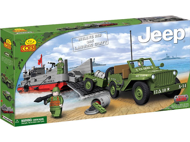 Jeep Willys MB i Łódź Desantowa to klocki dla małych strategów wojennych, pasjonatów działań wojennych na lądzie, morzu i w powietrzu. Z klocków można zbudować łódź, która pływa po wodzie oraz samochód Jeep Willys. Do dyspozycji jest także mała przyczepka z beczkami pełnymi zaopatrzenia.