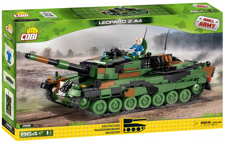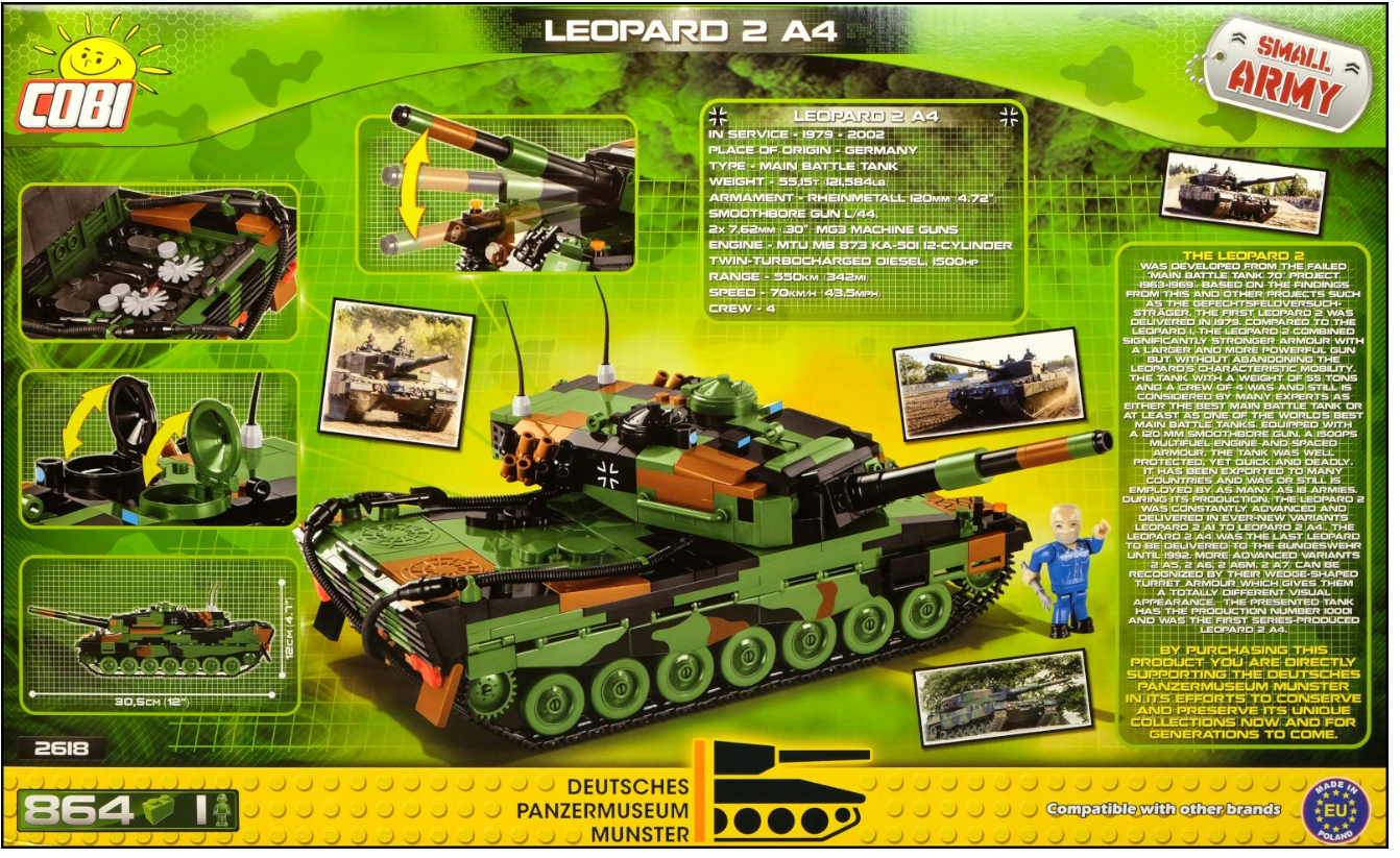 Model czołgu Leopard 2A4 stworzony z klocków konstrukcyjnych COBI został wiernie odwzorowany na podstawie swego rzeczywistego odpowiednika będącego w zbiorach niemieckiego muzeum Deutsches Panzermuseum Munster. Ruchome elementy takie jak: wieża i lufa czołgu, obracające się koła i gąsienice oraz otwierane włazy, pozwalają na znakomitą zabawę dla wszystkich nawet najmłodszych fanów militariów. Odtworzony został również silnik czołgu do którego można zajrzeć otwierając klapę serwisową. Każdy dorosły pasjonat historii oraz broni pancernej na pewno z przyjemnością ozdobi swą kolekcję tym modelem. W zestawie dostępna jest również specjalna figurka przedstawiająca jednego z najbardziej zasłużonych pracowników Deutsches Panzermuseum Munster.