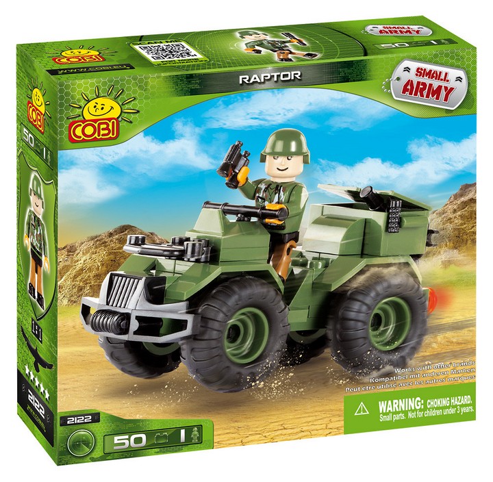 Cobi Small Army Raptor 2122 to bardzo mobilny pojazd przeznaczony do poruszania się w ekstremalnym terenie. Ten wszechstronny i dynamiczny quad sprawdzi się w sam raz w szturmowych jednostkach specjalnych. Wyposażony w dodatkowe akcesoria z pewnością zapewni żołnierzom odpowiednie wsparcie na polu bitwy.