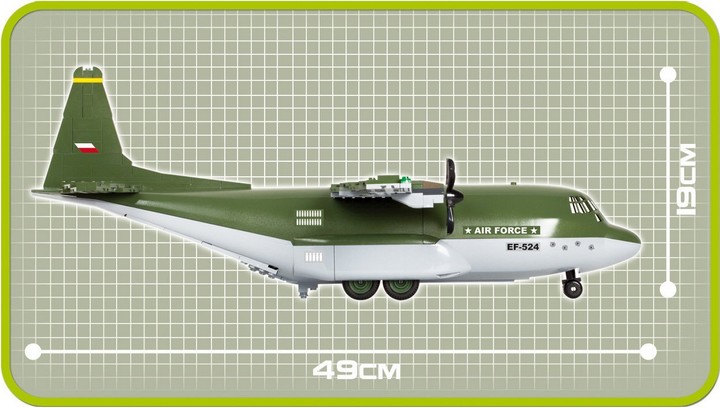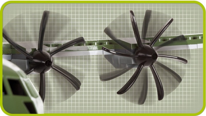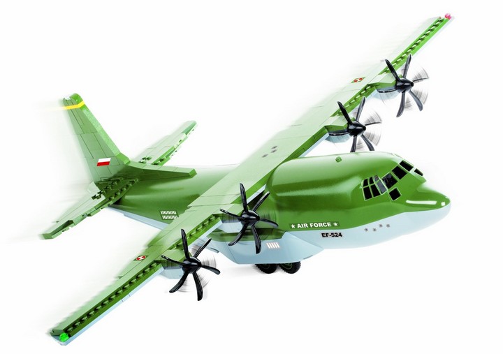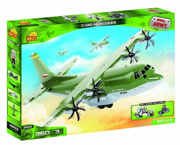 Cobi Small Army Samolot Transportowy 2603 jest odpowiednikiem transportowca Herkules C-130. Ten ogromny, wojskowy samolot charakteryzuje się dużym lukiem bagażowym, w którym mieści się skład beczek, jeep, motocykl oraz 3 żołnierzy. Na spodzie Herculesa są duże koła, a każde ze śmigieł się kręci. Dzięki niemu Mała Armia z łatwością będzie mogła przewozić najróżniejsze ładunki podczas działań wojennych.