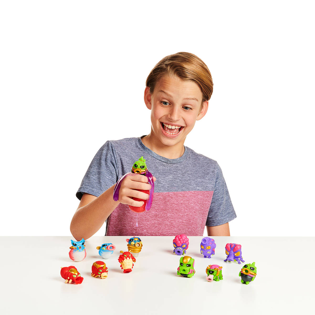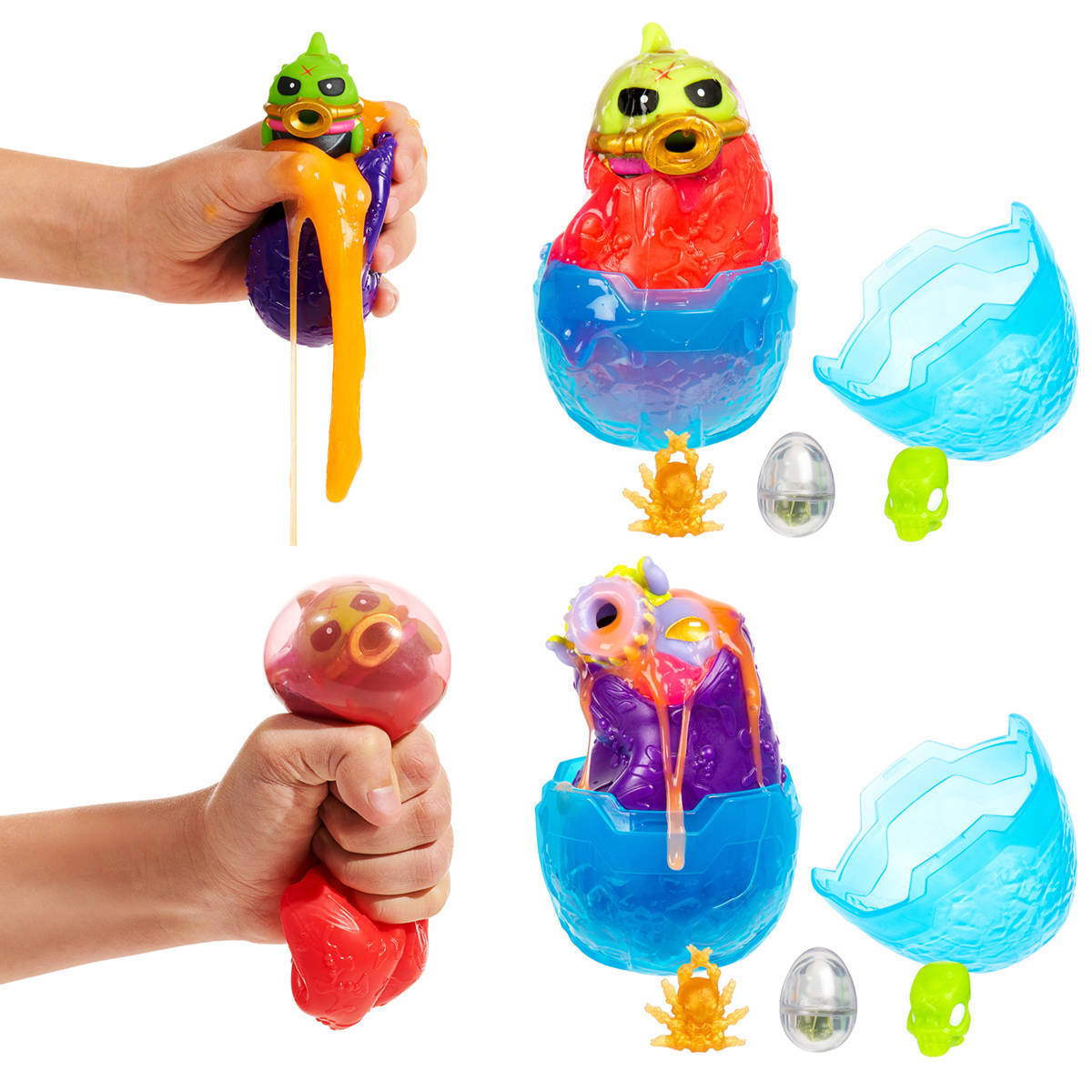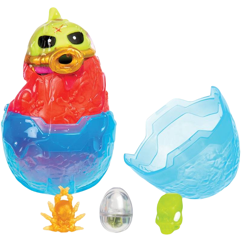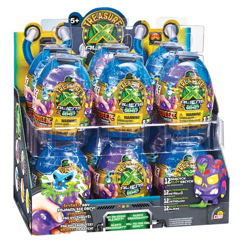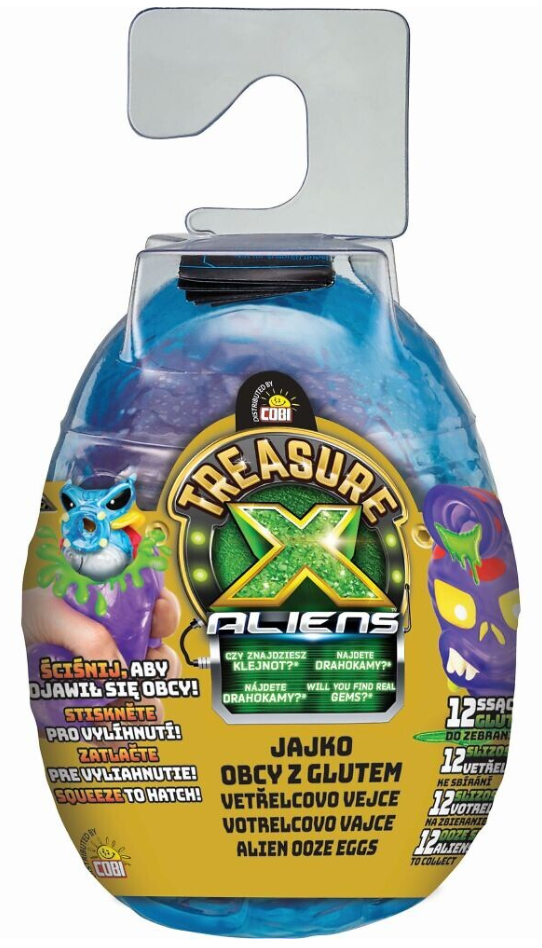 Obcy w Jajkach wylądowali i chcą się wykluć! Otwórz twardą zewnętrzną skorupkę, aby odkryć miękkie Jajko! Ściśnij Jajko i zobacz jak eksploduje! Super! To mały Obcy cały w glucie. Poszukaj w glucie także skarbu. Czy znajdziesz w środku prawdziwy klejnot? Ci mali kosmici uwielbiają ssać glut! Ściśnij boki Obcego i zobacz, jak siorbie i wypluwa glut! Jest 12 figurek Obcych do zebrania i 13 różnych skarbów.