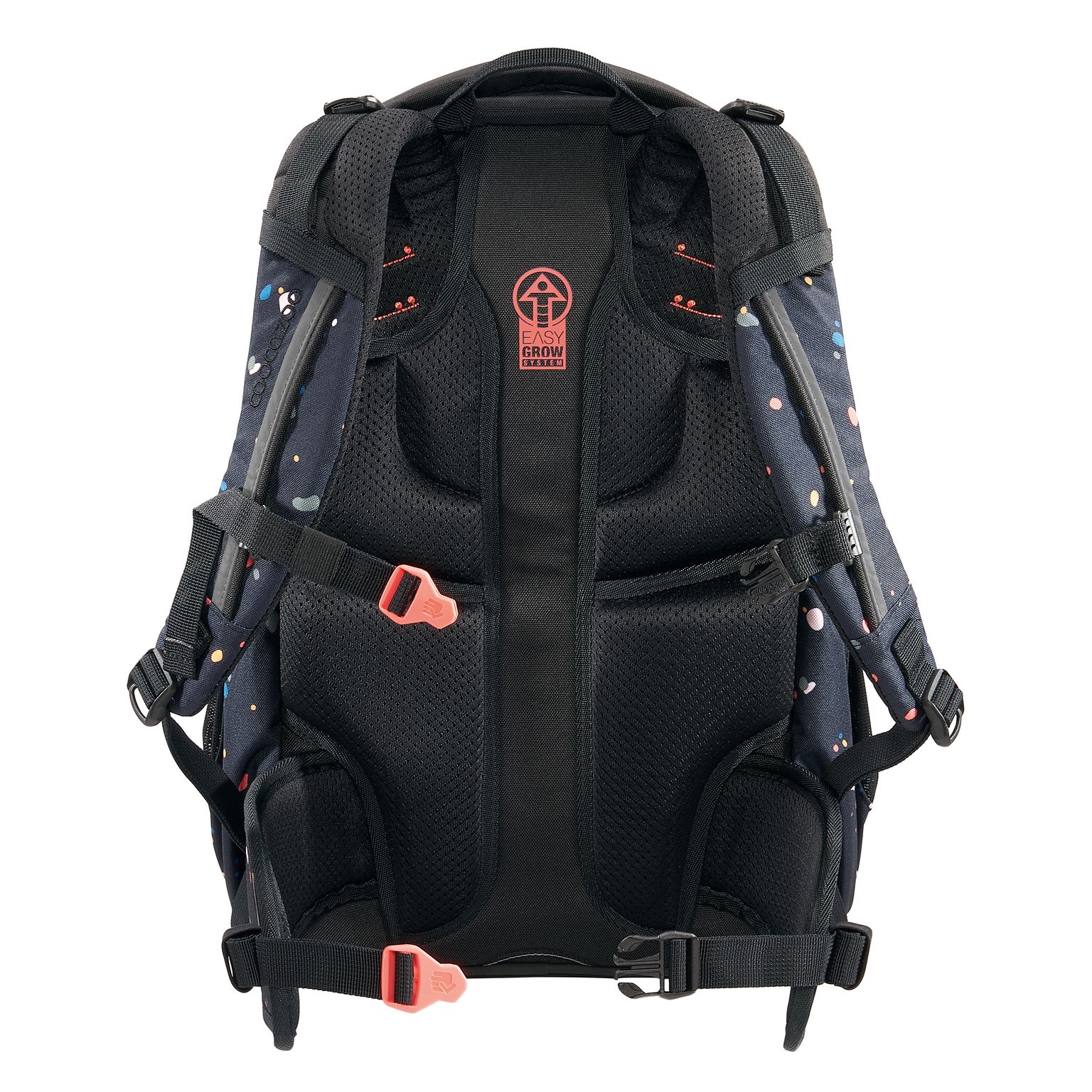 System Easy Grow to wzór na zdrowe plecy i wygodę. Dzięki wbudowanej regulacji umożliwia indywidualne dopasowanie plecaka do osoby o wzroście od 135 do 180 cm. Zaznaczone na szelkach kropki wyznaczają optymalną wysokość położenia szelek.