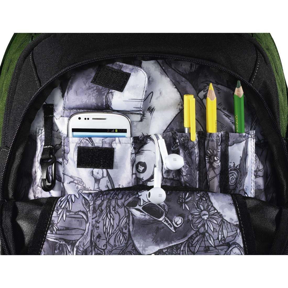 - Średnia kieszeń z organizerem na długopisy, telefon oraz zawieszką na klucze