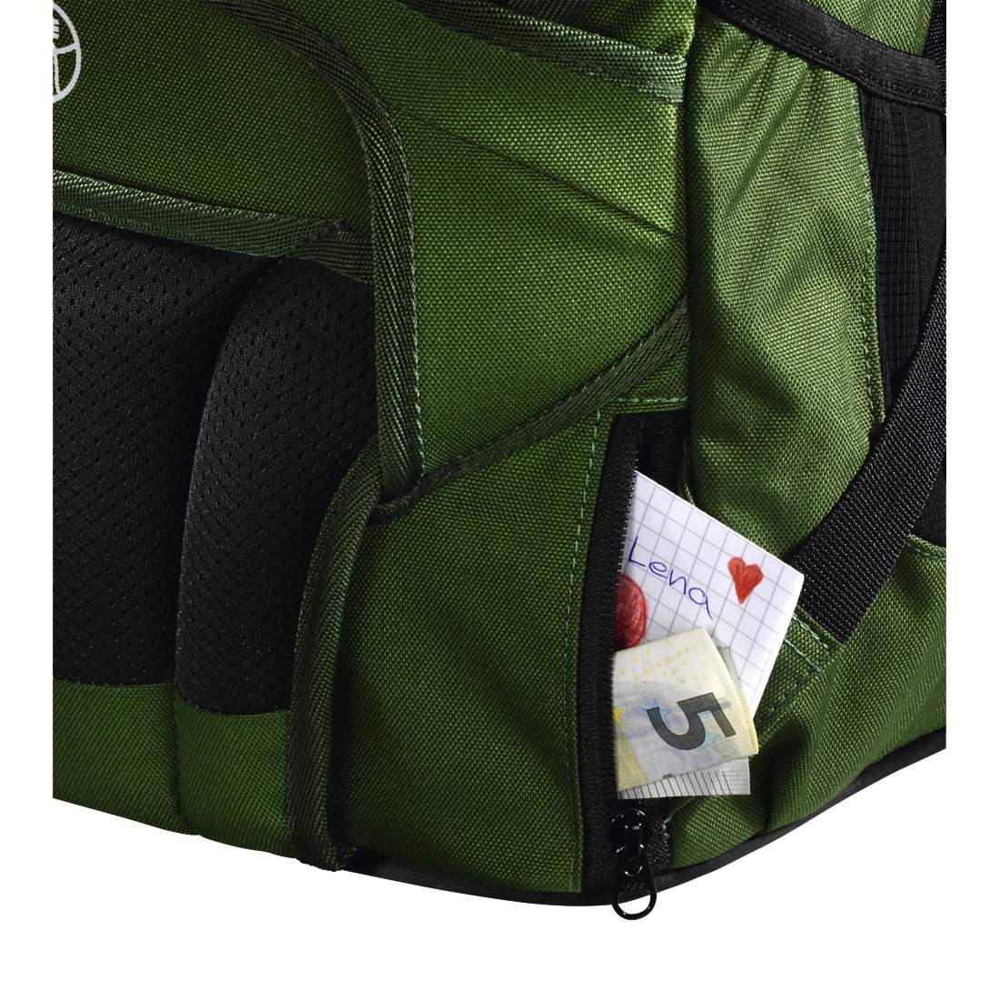 - Malutka, ukryta kieszeń na dolnej, tylnej stronie plecaka np. pieniądze