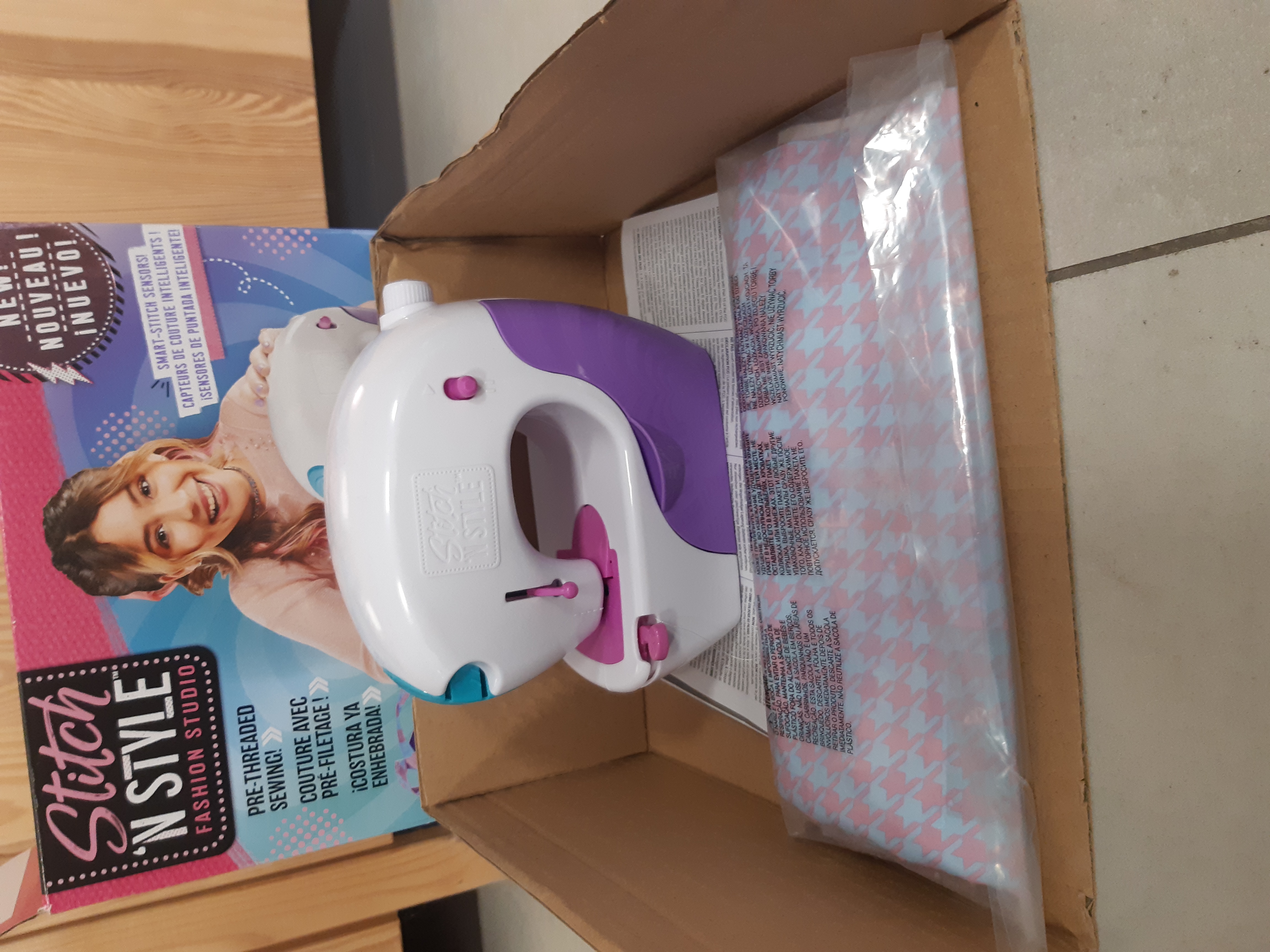 W zestawie znajduje się materiał w różowo-niebieską kratę z nadrukowanymi liniami, które ułatwią naukę prawdziwego szycia. Ponieważ maszyna jest jednak zabawką, ważne jest, aby do szycia używać tylko cienkich tkanin, które mieszczą się pod osłoną igły (NIE dla dżinsu, skóry, itp.)