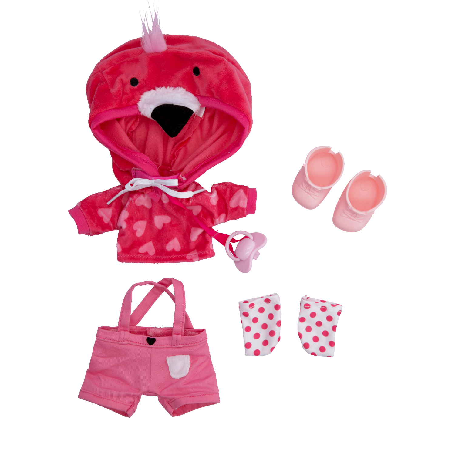 Bobas Fancy ubrany jest w śliczne, spersonalizowane ubranko flaminga (kurteczka, spodenki, skarpetki, buciki).